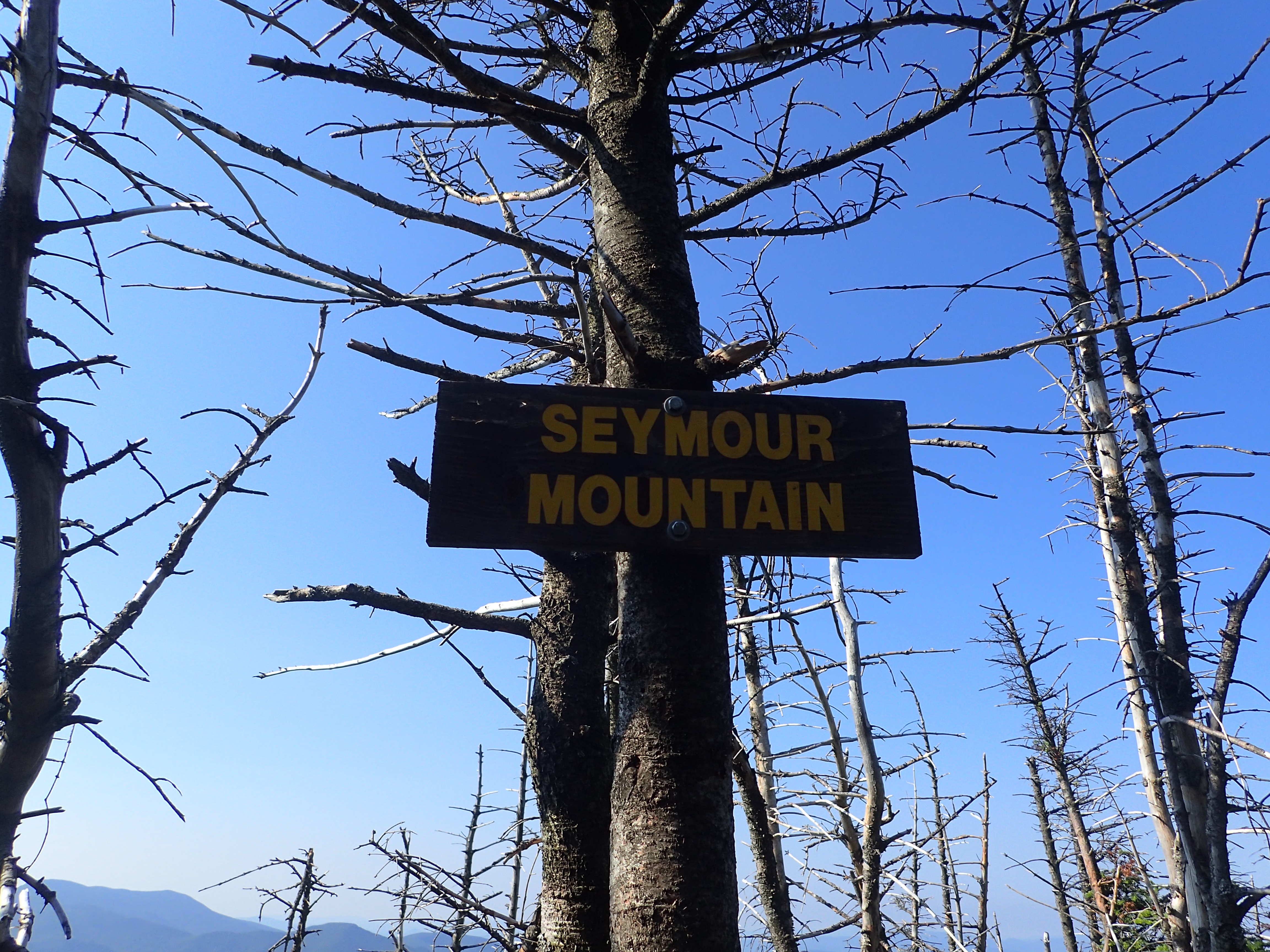 By 8:56 am I was enjoying the views on top of Seymour. On this day there were bright blue skies with hardly a cloud in sight. Seymour is a wooded summit but still offers some excellent views from the top. Especially of the other three mountains in the range.
