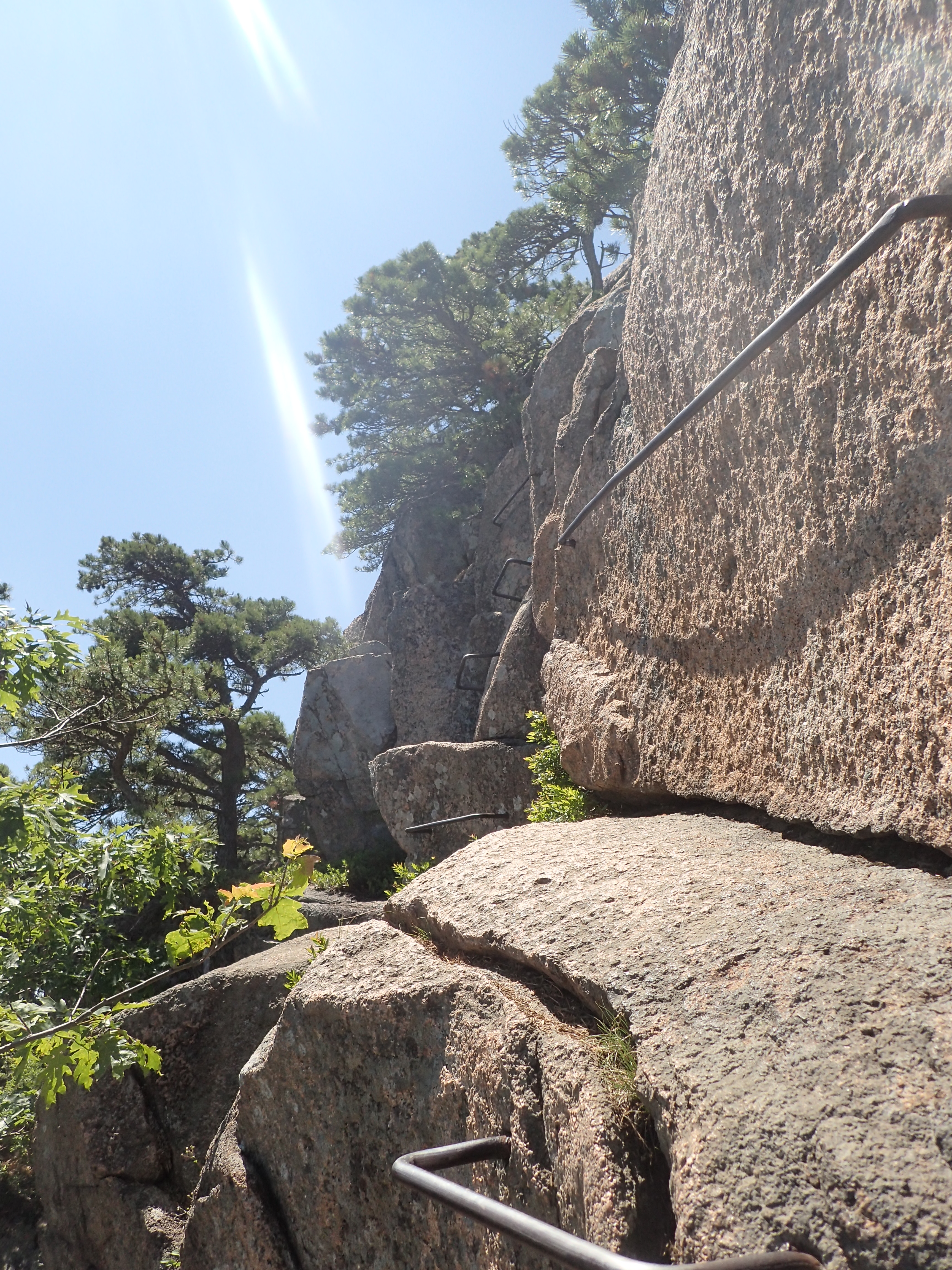 The whole cliff is only a couple of hundred feet tall so you ascend it fairly quickly. The trail did narrow in a few spots and at one point we came upon a family with children who when things got a bit steeper decided to back off and walk back down the way they came. At this point the trail begins to have many iron rungs to help you negotiate the steeper sections. I found this part to be easy but enjoyable considering you have such amazing views of the ocean behind you. My only complaint is that the rungs and hand holds on the rock were very greasy from everyone’s sweat and sunscreen. Either way it never felt unsafe and you can just take your time negotiating these sections. I think if you can climb a ladder you should have no problems on this trail.