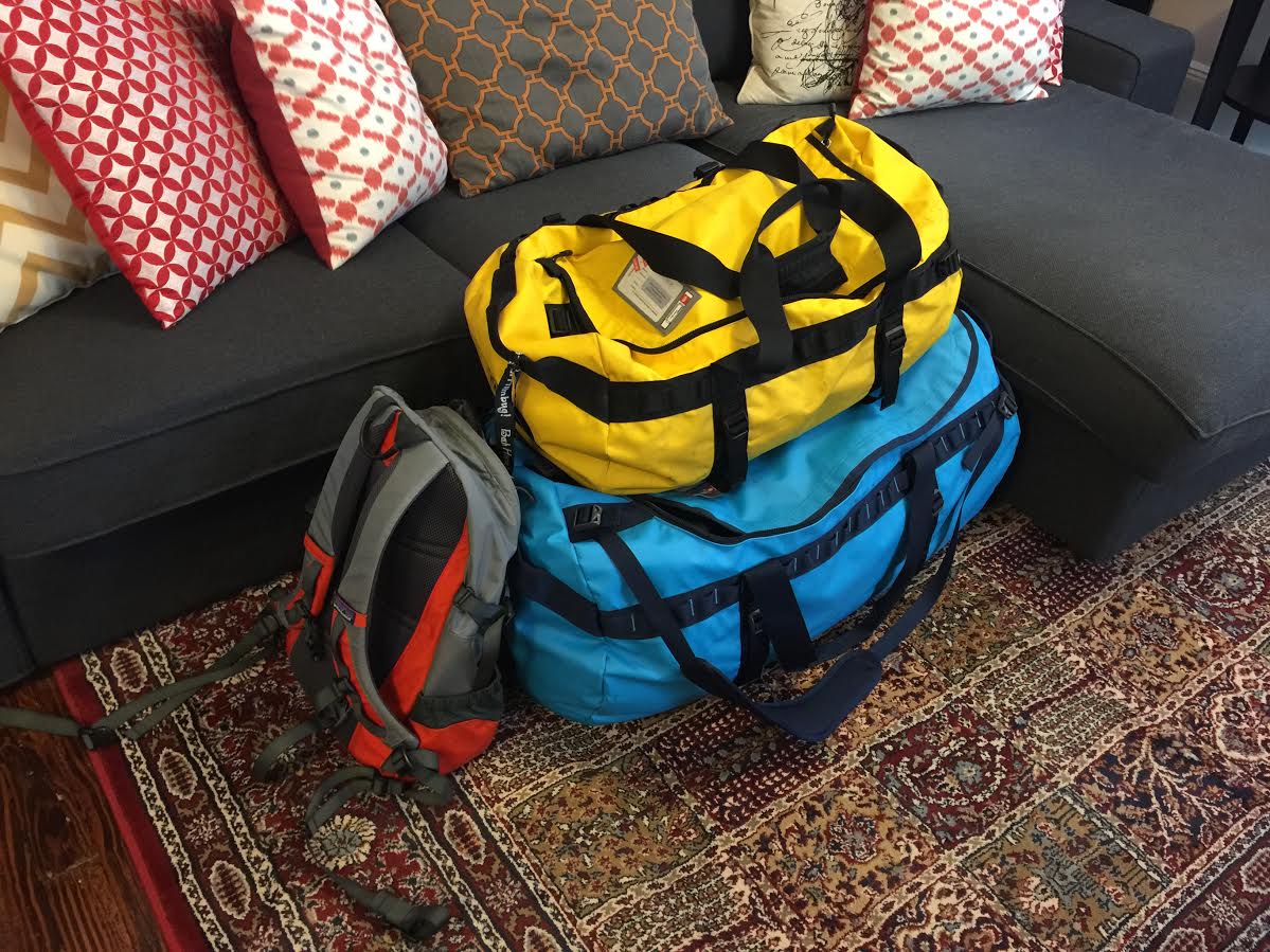 I was packing everything into two North Face Base Camp Duffel bags which I would be checking in at the airport. One is a size medium and the other is an extra large. The larger blue blag is a new addition for me but I have flown with my smaller one many times and I have to say it is a fantastic bag. It is truly as bombproof as they advertise it to be. I would highly recommend them if you are in the market for a tough gear bag for traveling.