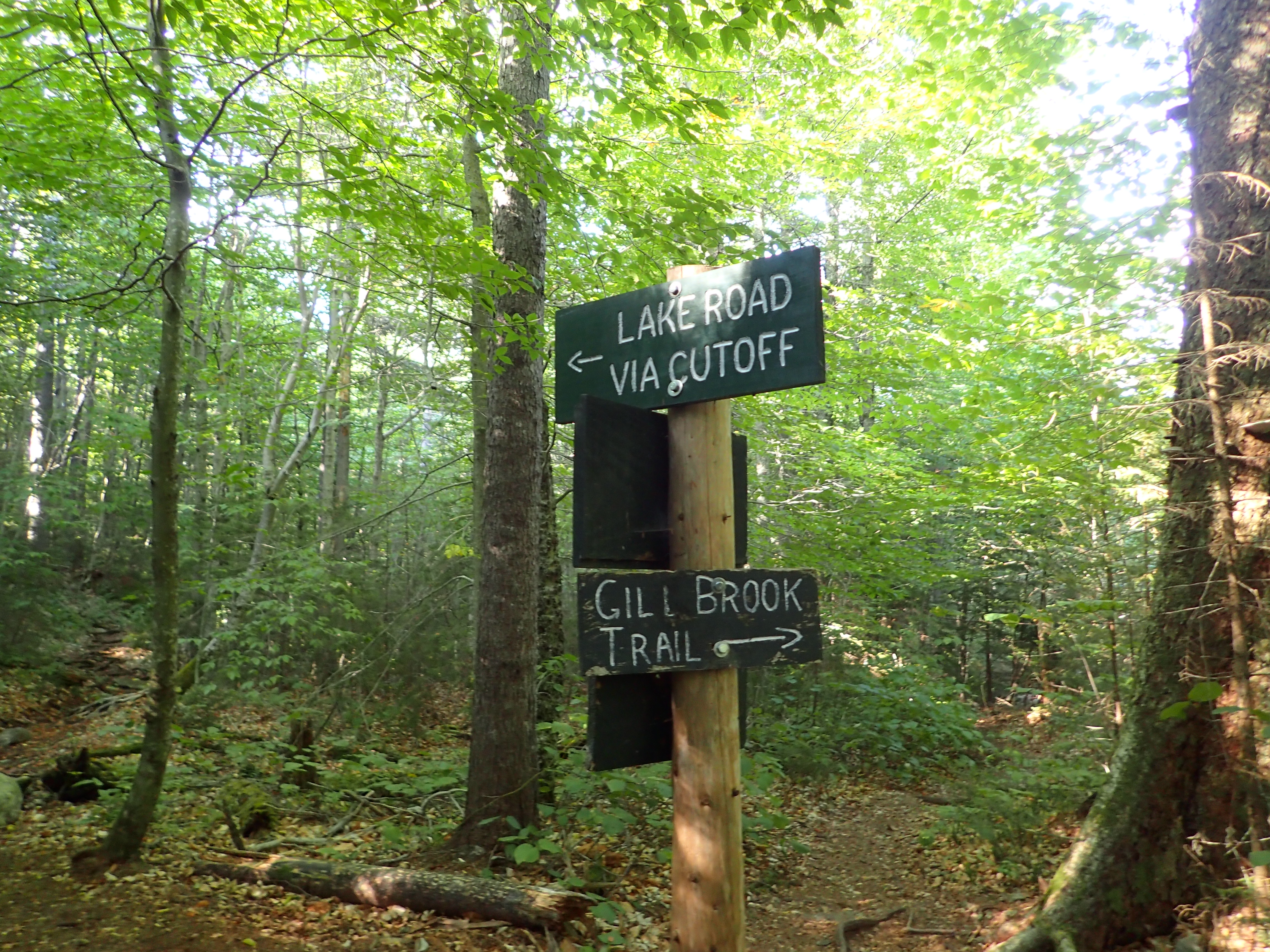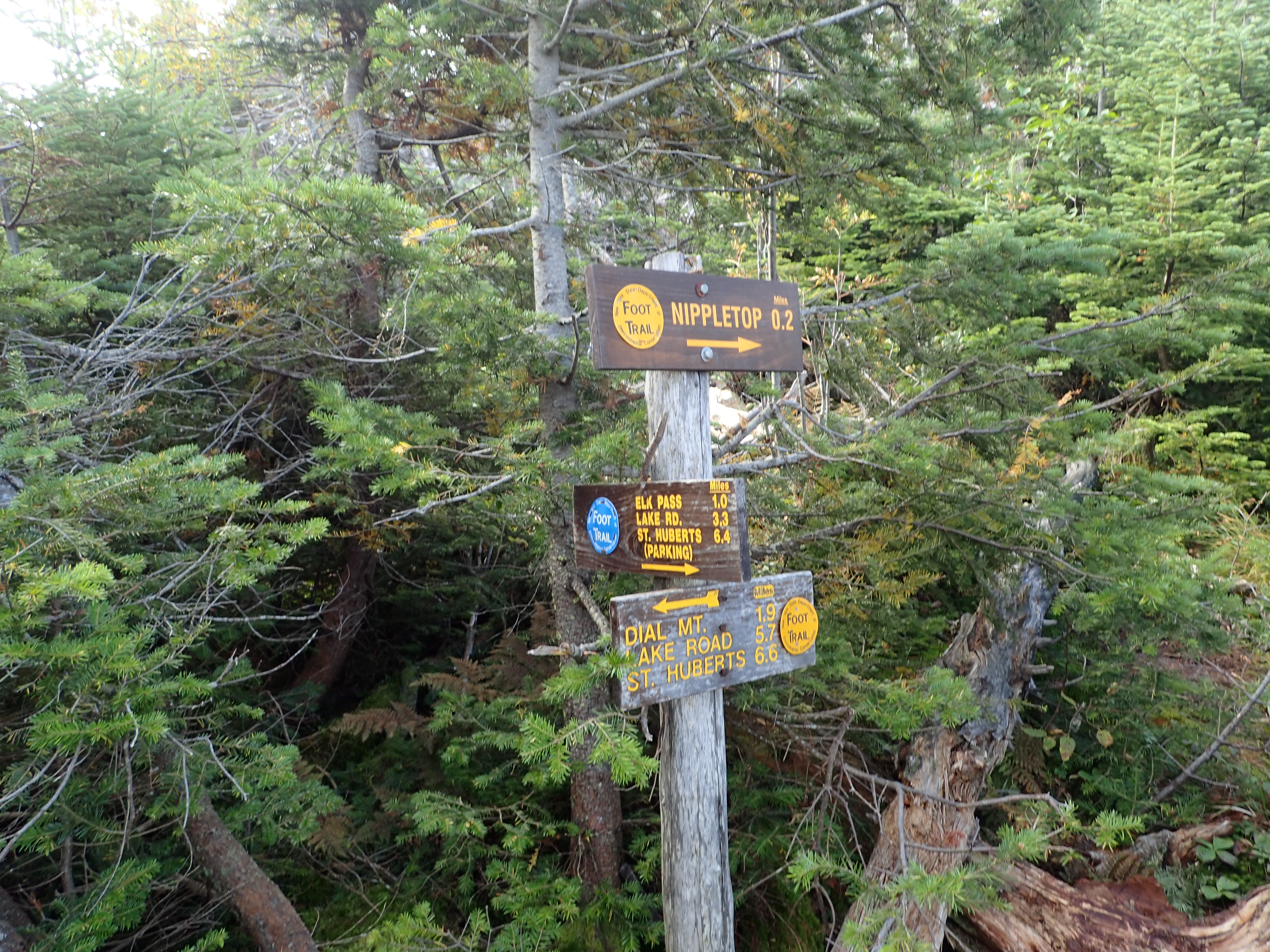 Trail junction sign marking the top of the Noonmark Shoulder just before opening up onto the exposed slab.