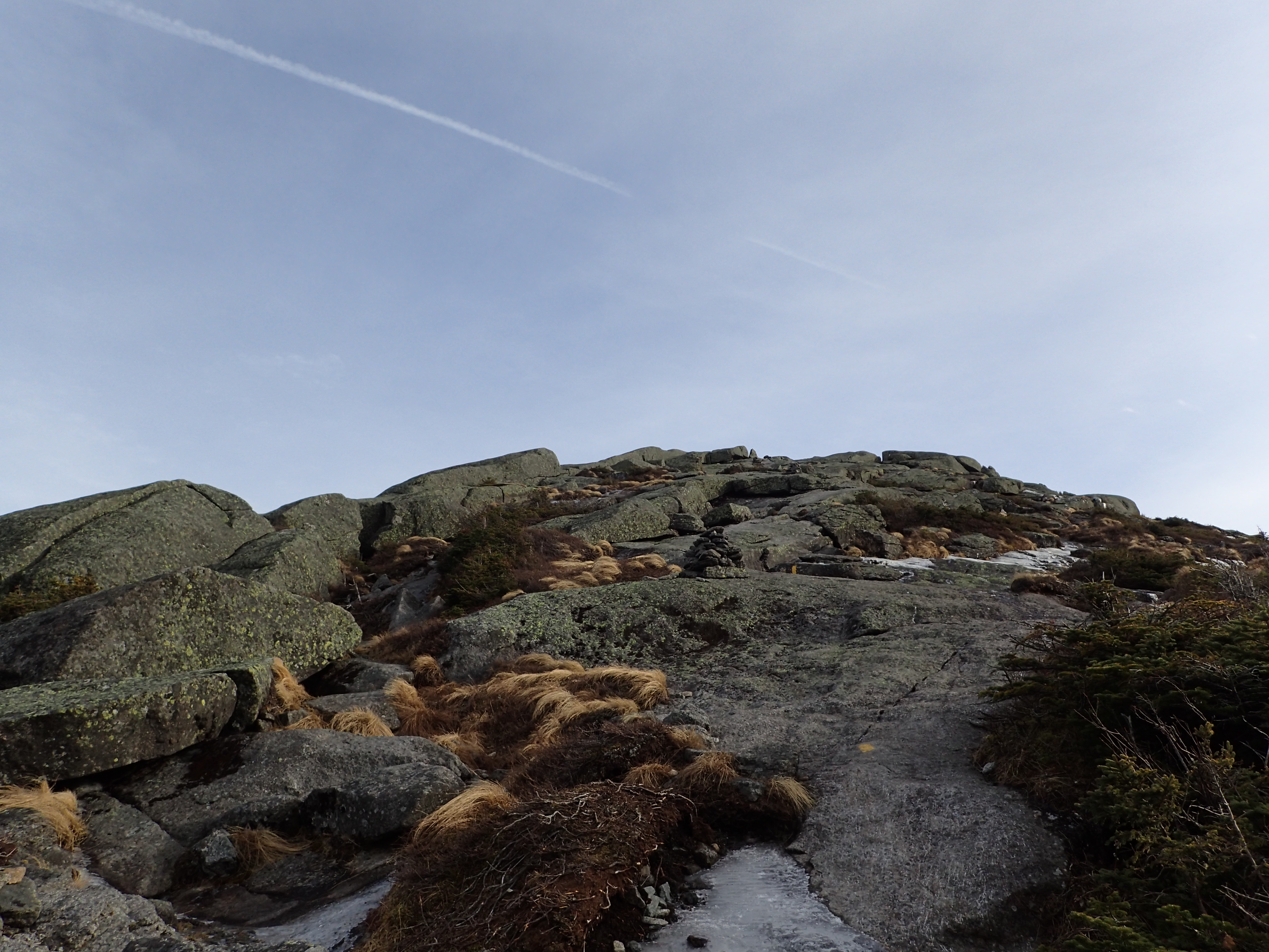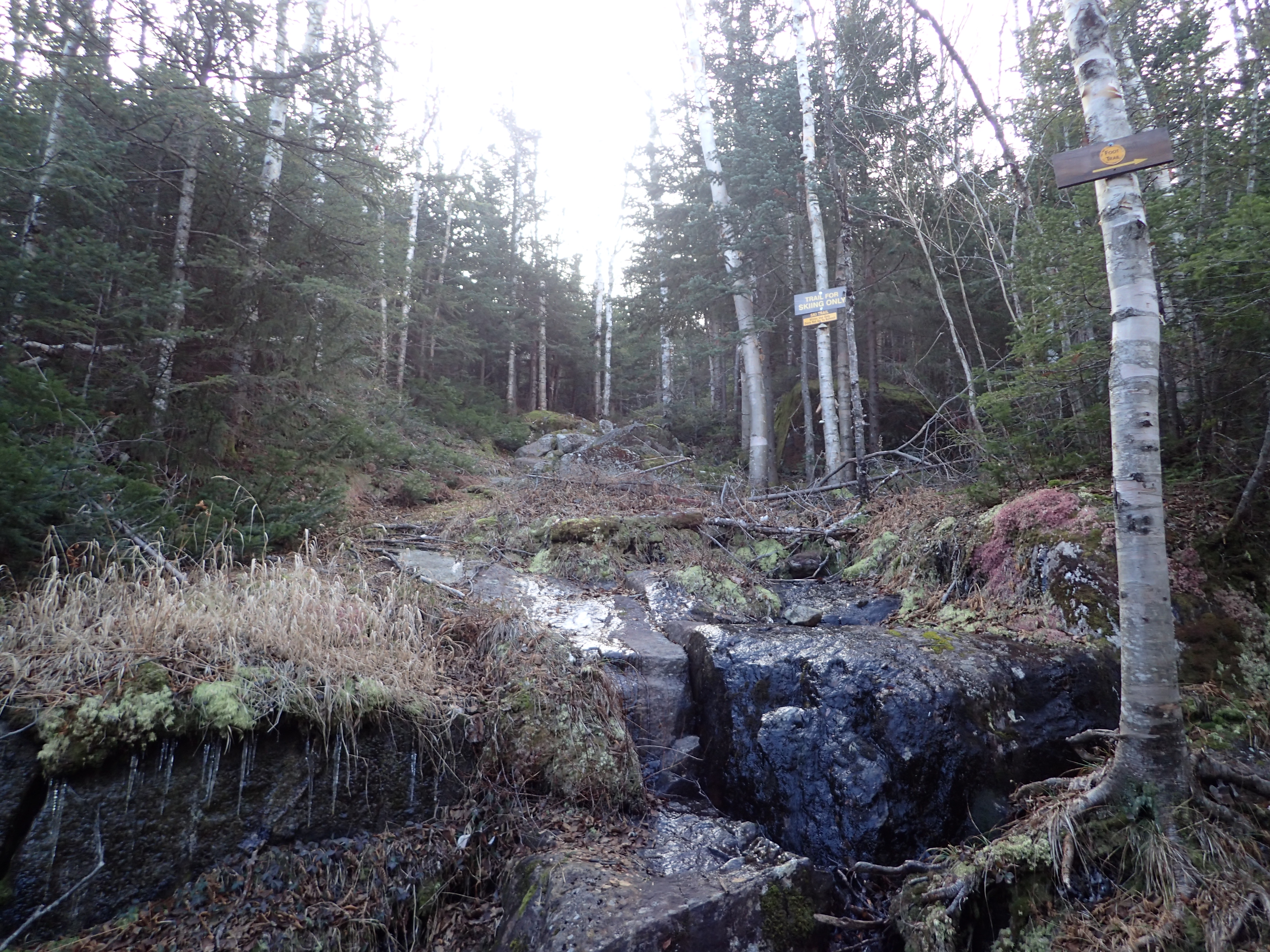 At the ski trail junction I had stopped for a quick drink and to delayer letting the other group pass me but I ran into them again a short distance forward at the first steep slab on the trail. At this point there was more ice on the trail but it didn’t totally cover the trail so I still didn’t put on my micro spikes, but I do believe the other group did. Since I didn’t stop to put on my spikes I walked up to the slab and picked a line up the right side of the slab avoiding most of the ice and was able to get up and over without much difficulty.