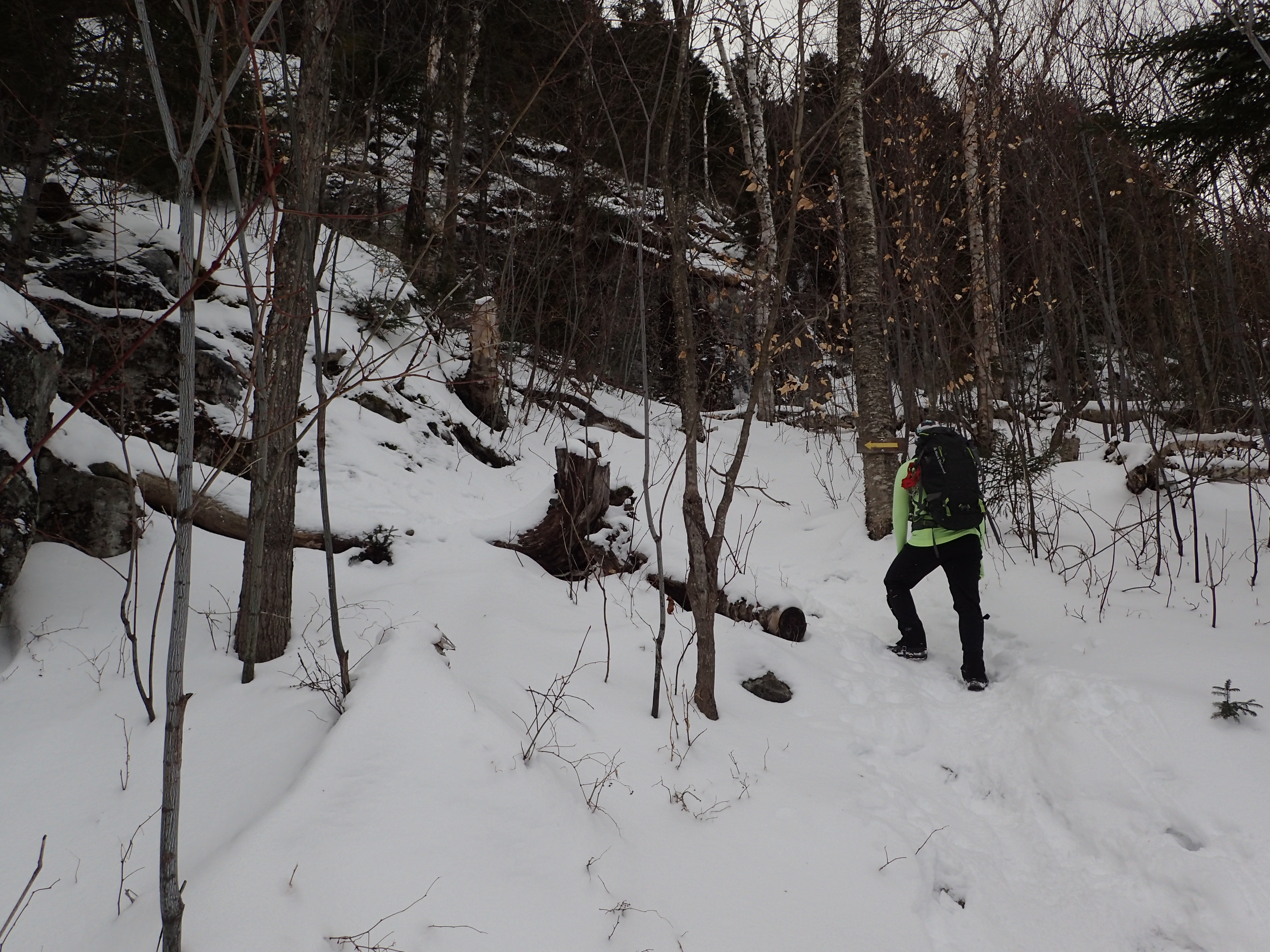 Despite the increased steepness there was enough fresh snow that we did not need our microspikes to safetly navigate the trail. Beyond the covered slab we continued the hike up the ridge through increasingly coniferous forest.