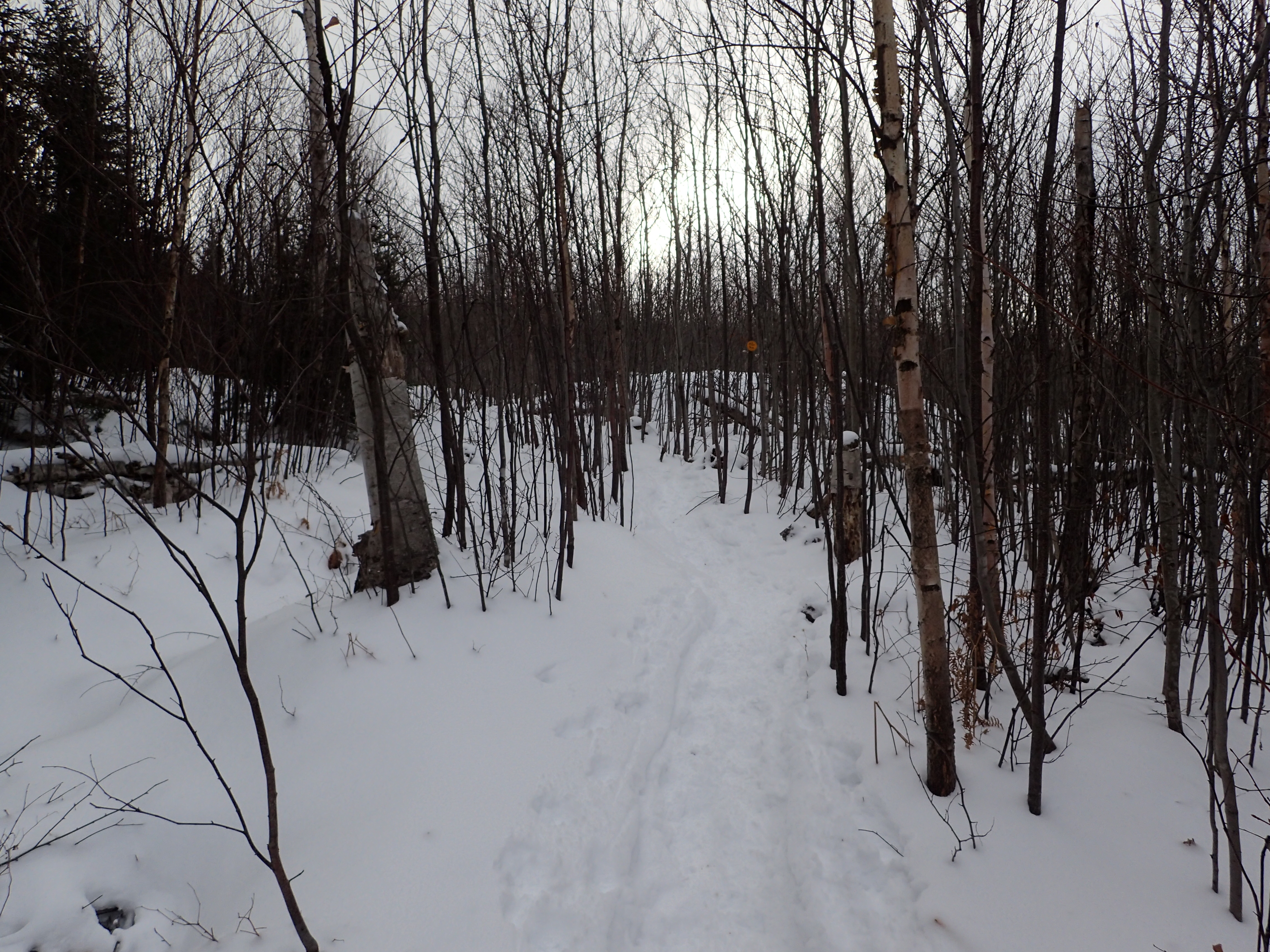 From this point on the trail got increasingly easier and the weather also warmed up a bit making it easier for us to make quick progress down the trail. Once we made it about halfway down the last 1.1 miles to Lake Rd we passed an Ausable Club trail sign pointing us in the direction of the road.