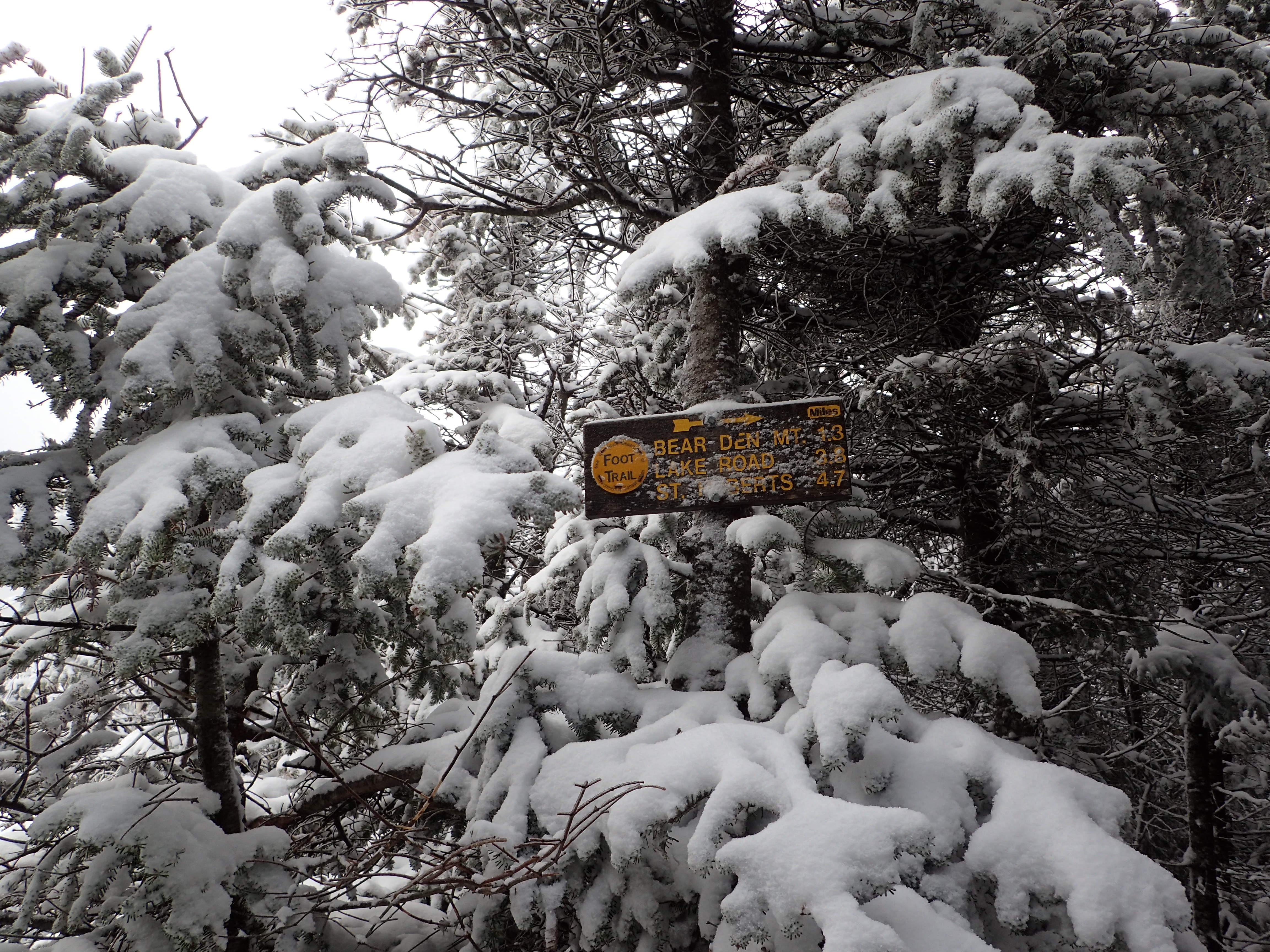 Bear Den Mountain is completely wooded and without the trail junction sign you would probably not even realize that you had climbed it. Since there was no view to speak of from the trail we just kept on trucking down the trail towards the summit of Dial.