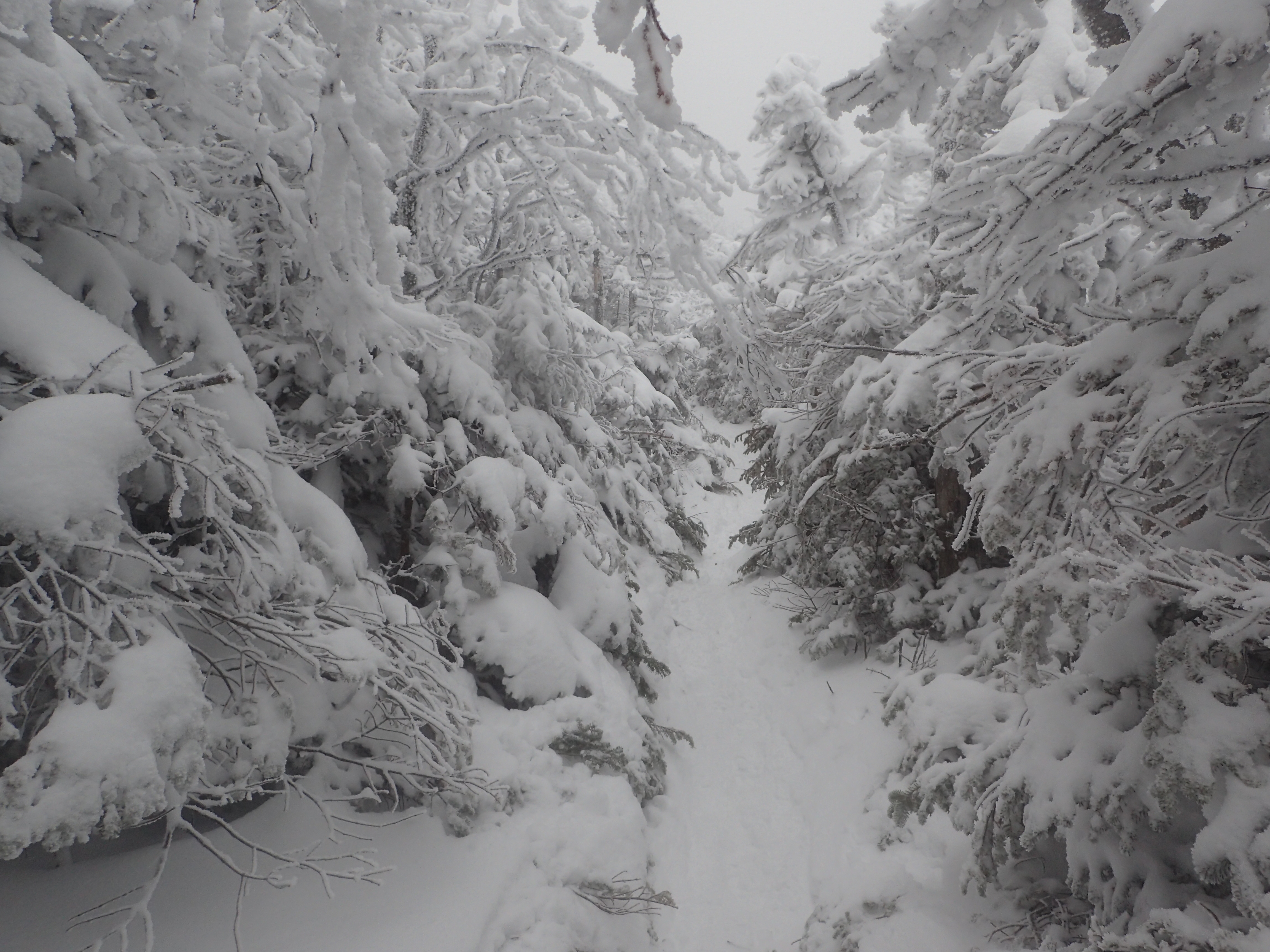 Once we got closer to the summit of Nippletop we were mostly in the clouds and the snow cover got a good bit deeper.