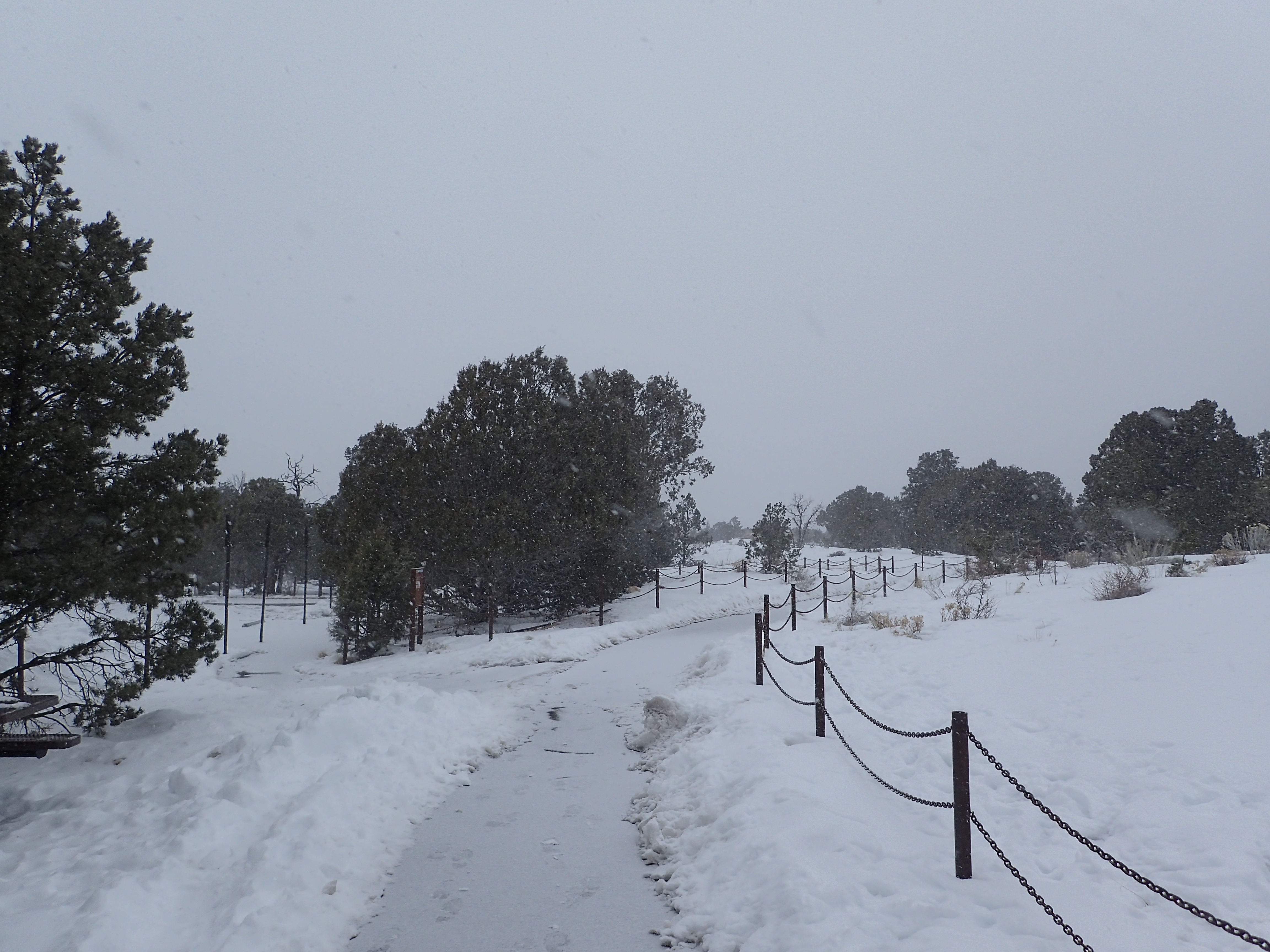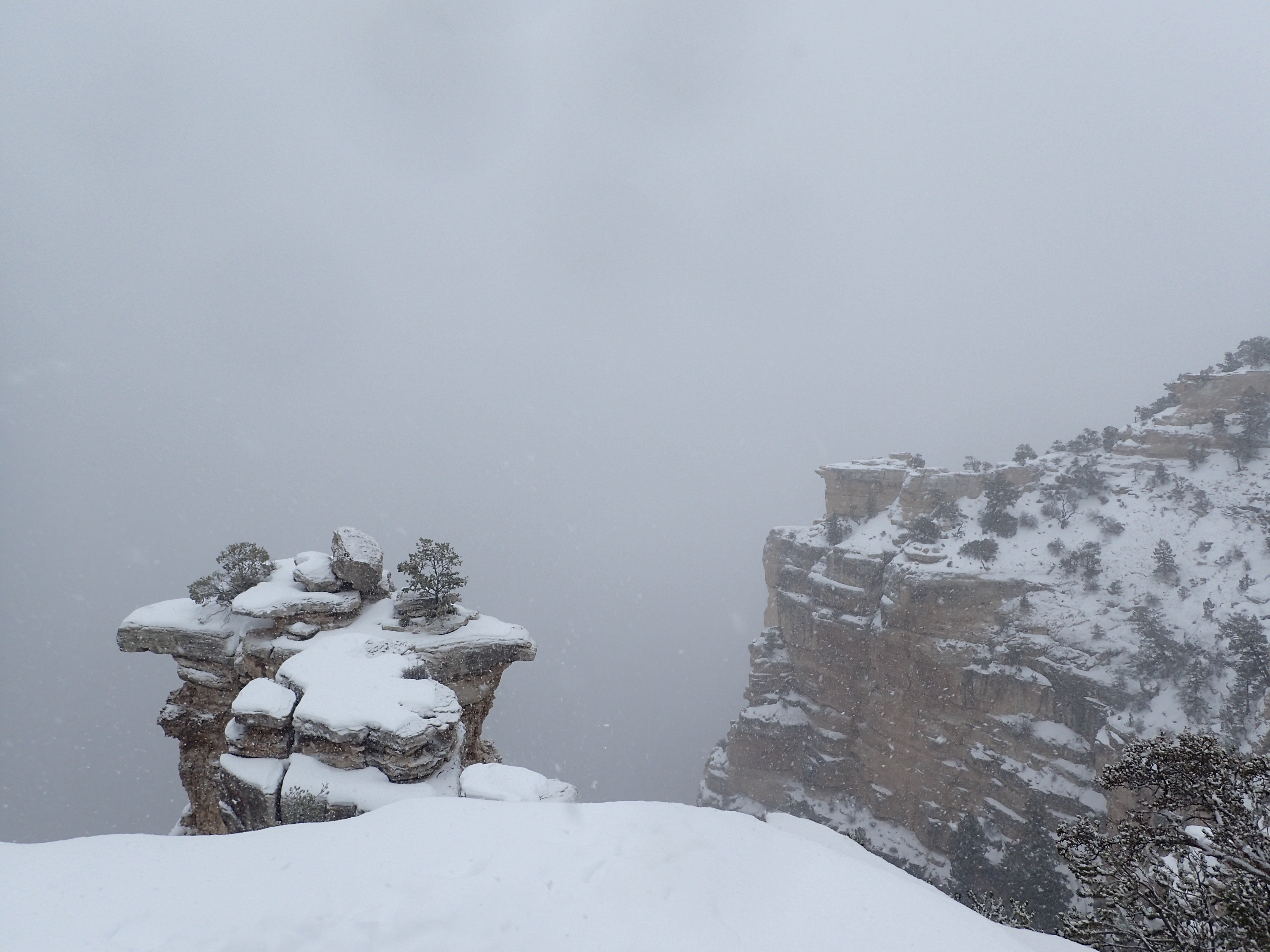 We left Phoenix bright and early and caught a beautiful sunrise over the desert as we made our way up towards Flagstaff. As we reached Flagstaff the snow cover got thicker but the weather was still clear so we were hopeful the weather would hold once we got up to the rim of the canyon. Sadly almost immediately after passing the entrance gate to the park the snow picked up and visibility dropped to almost nothing. We made our way to the visitor center parking lot and walked towards the canyon rim along the ice and snow covered paths.