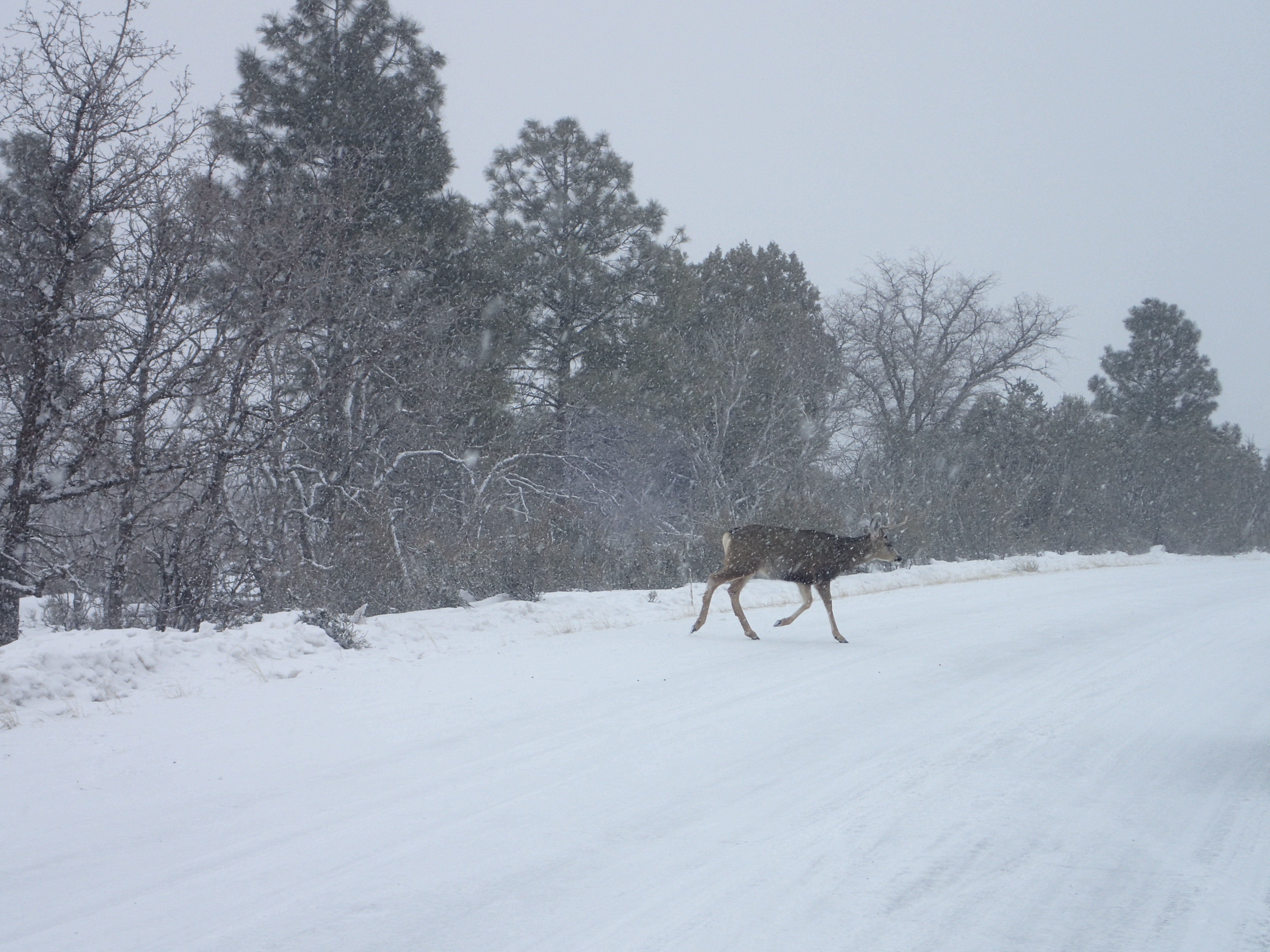 After enjoying the view for a few minutes we decided to just keep on our way towards Zion National Park where we were planning on spending the next day. The drive out was slow going as our rental care was ill equipped for the snowy roads but that turned out to be a good thing as we did happen to see a herd of mule deer crossing the park road on the way out.