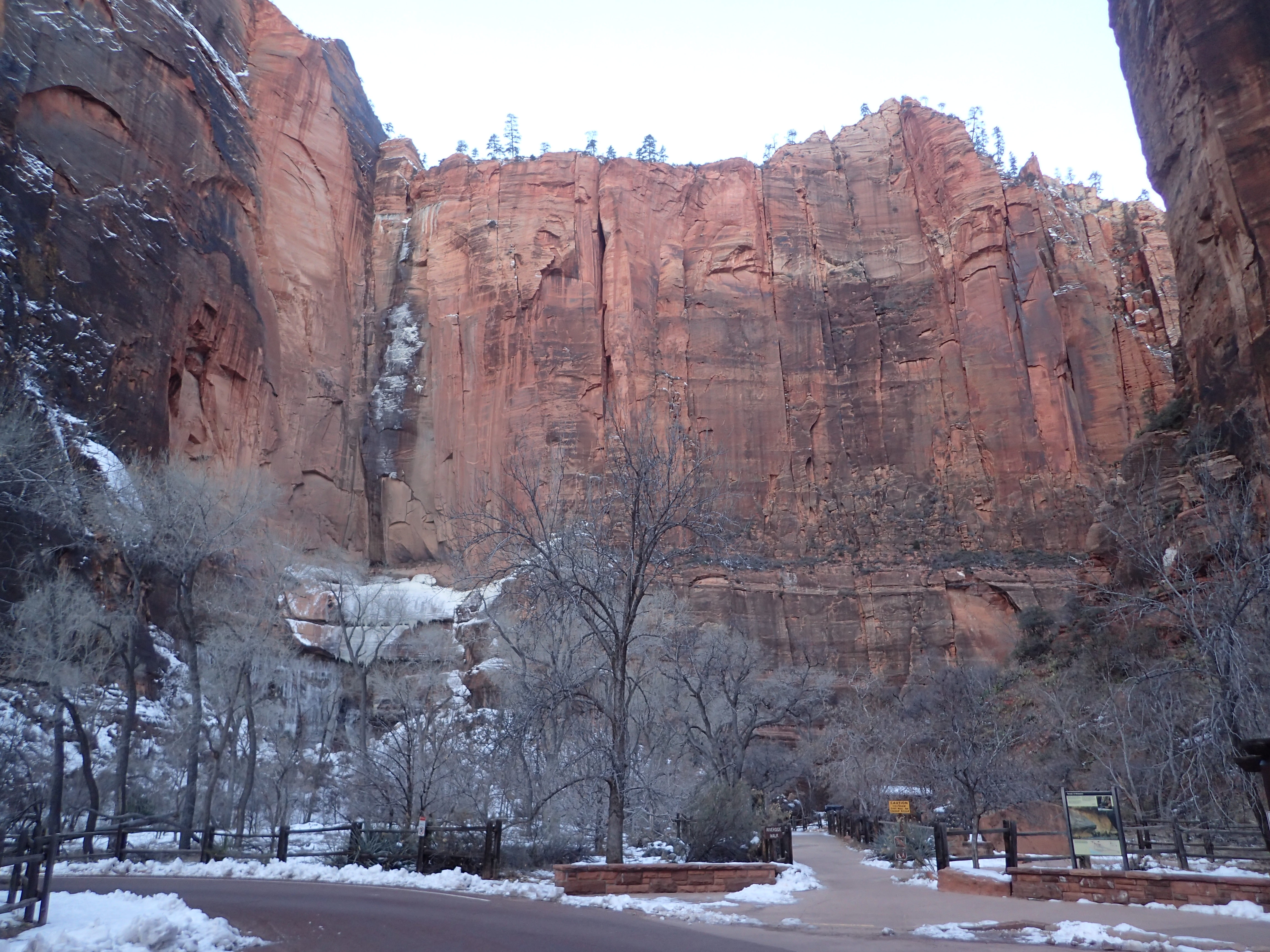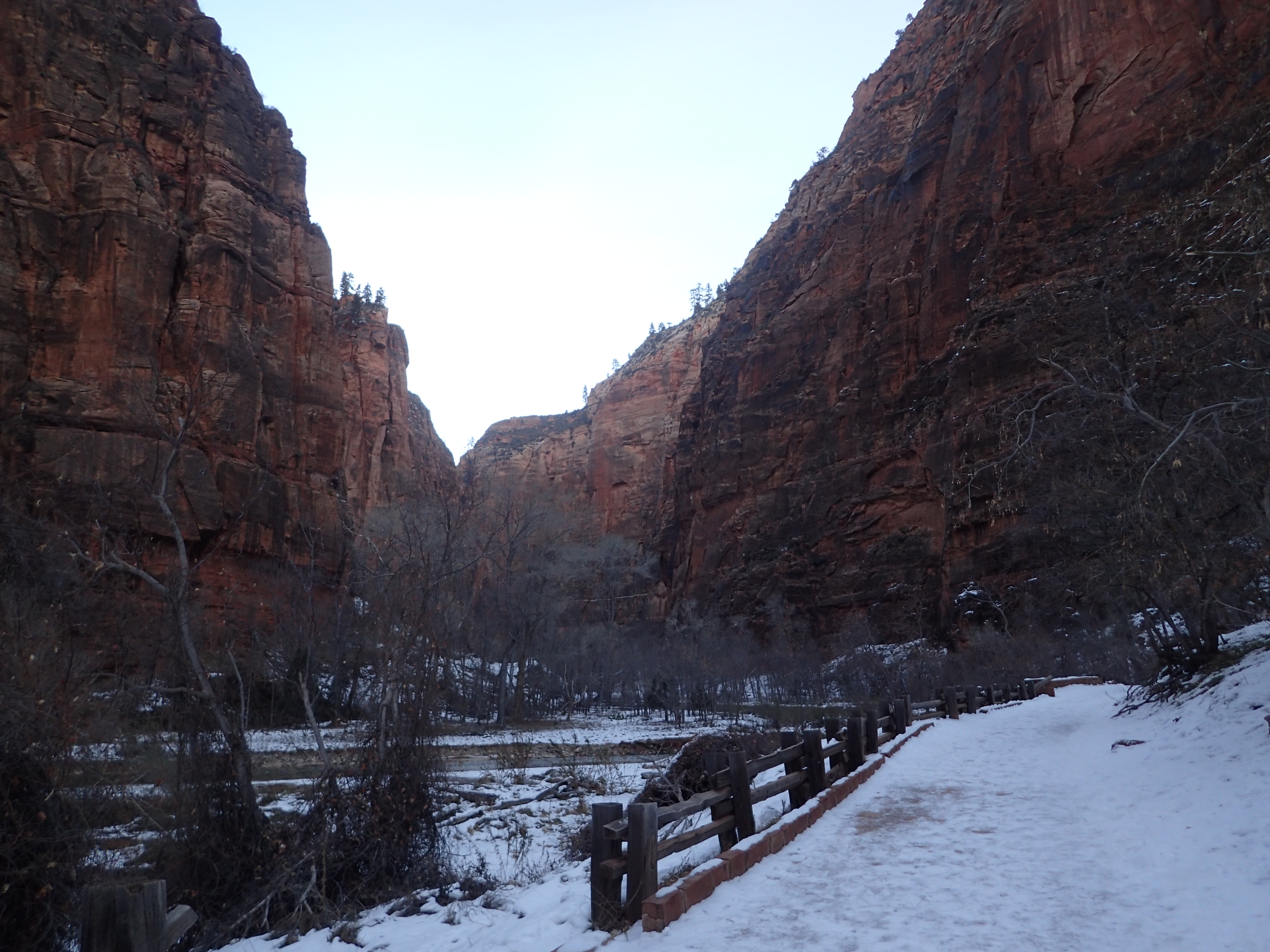 Despite the beauty surrounding us it was hard not to be a bit bummed out, but we were determined to try and find something short to hike that fit our schedule so we drove back over towards the Emerald Pools. From all the pictures I had ever seen of the Emerald Pools I figured it was worth the short hike over and we figured surely this trail would be open. After parking the car at the trailhead we began walking along another similarly paved path which was a bit icier than the last one but still an easy path to walk.