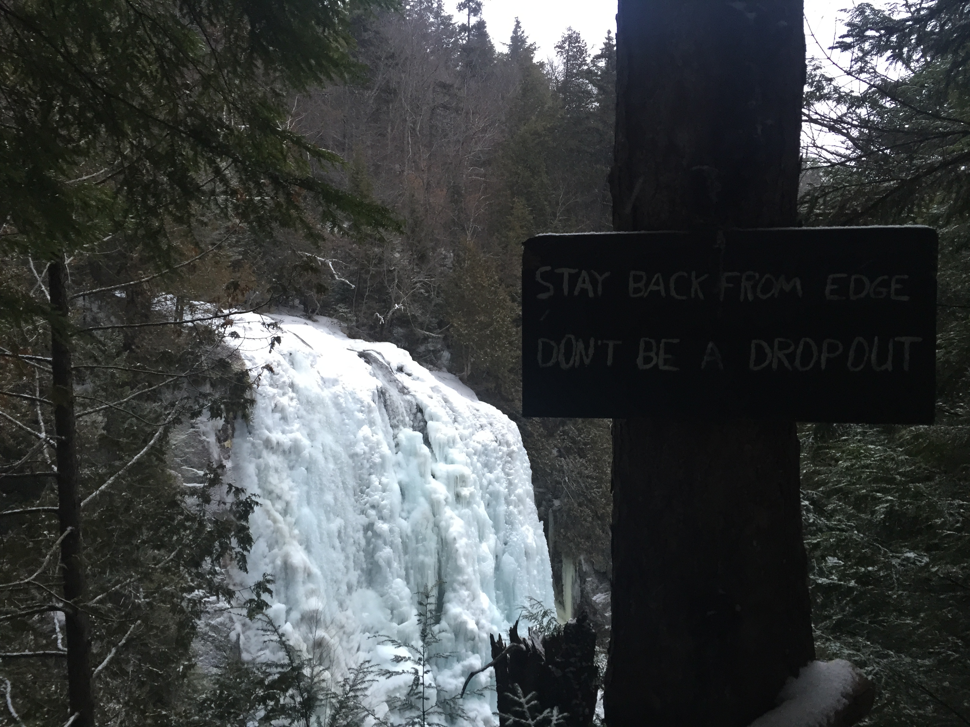 After a short bit of hiking we reached the cutout on the trail for the lookout over Rainbow Falls. The overlook is quite overgrown but it is still clear enough to get a decent view. On this particular day the waterfall wasn’t completely frozen and water could be seen pouring freely over the falls.