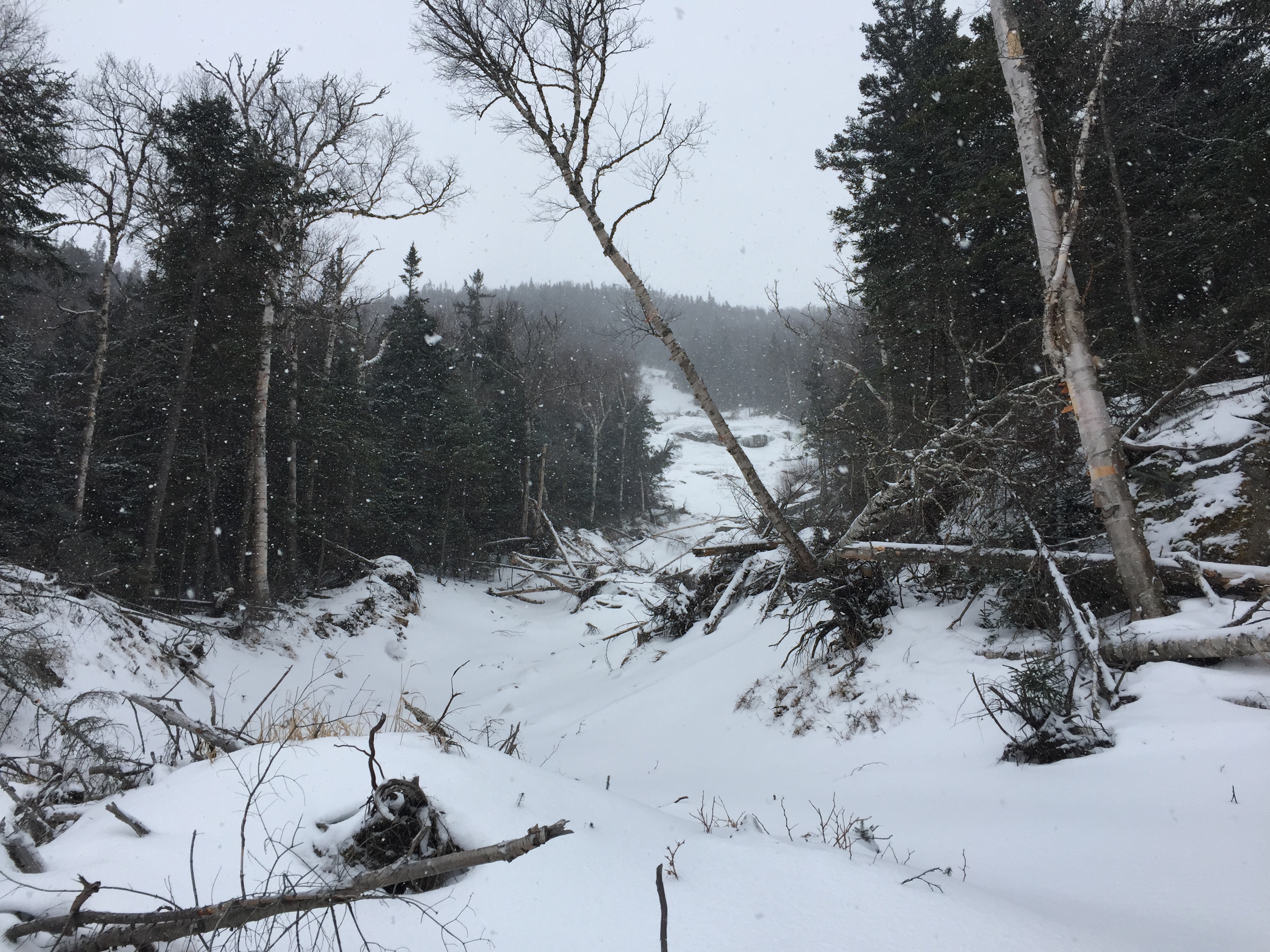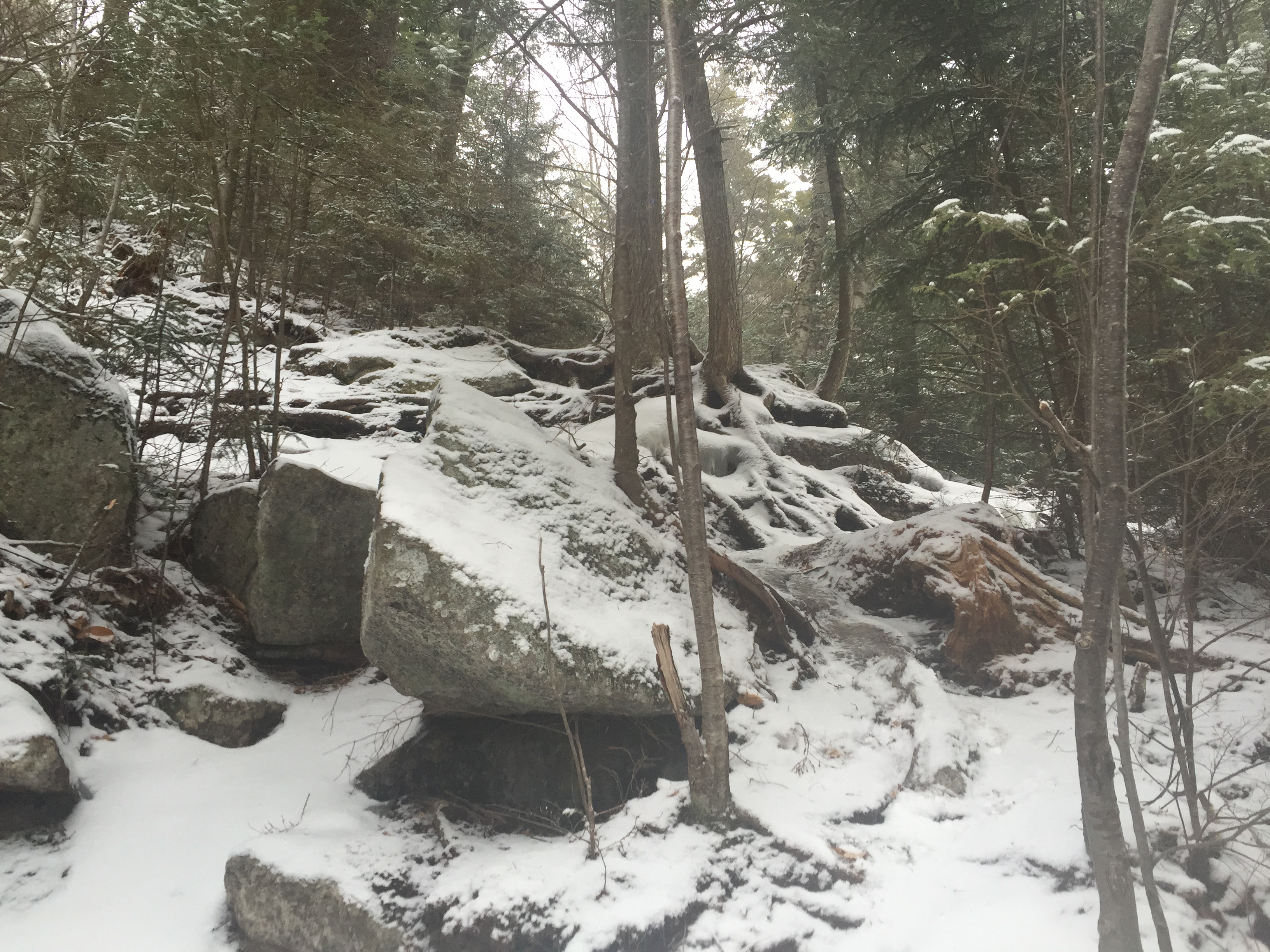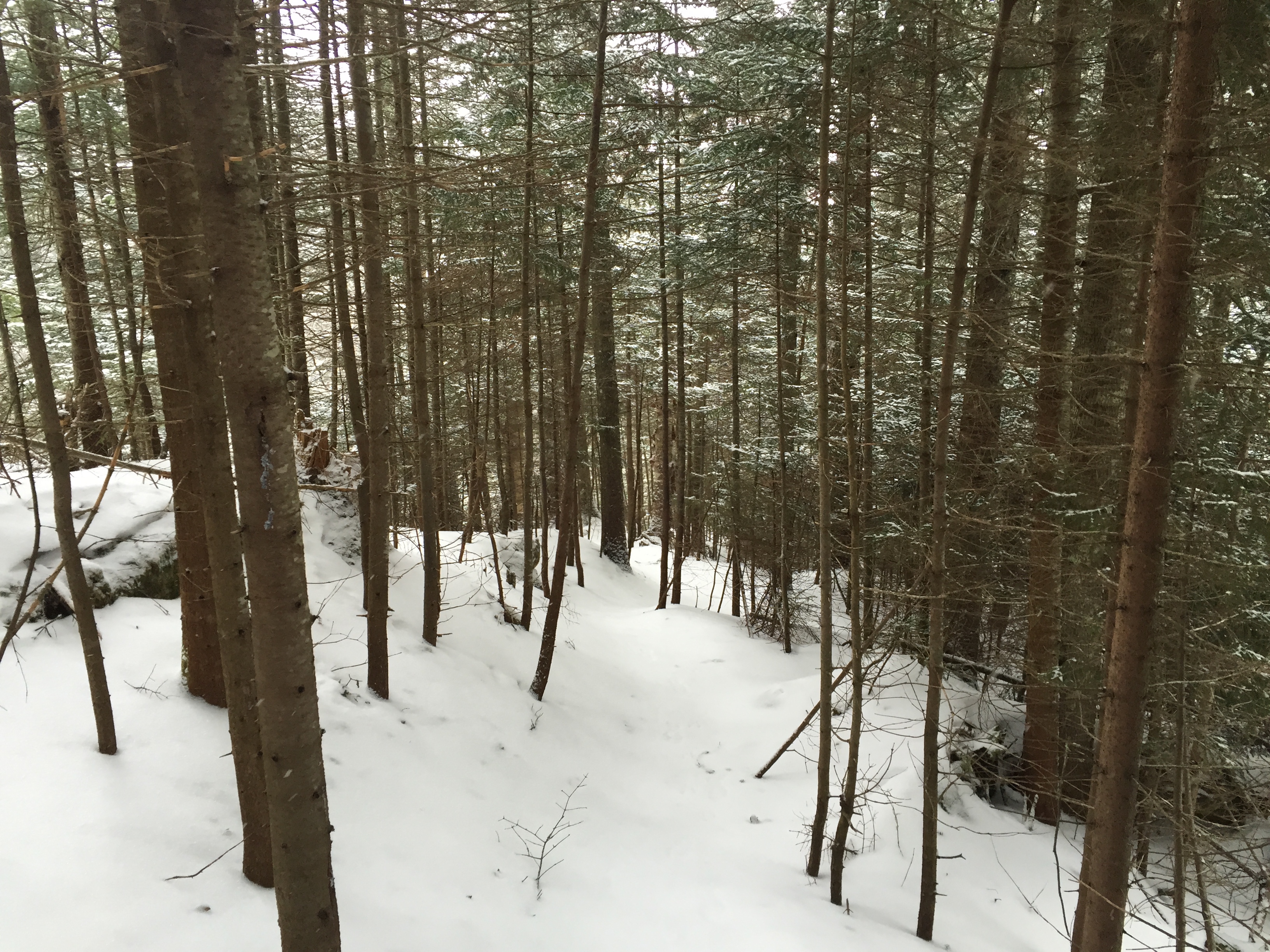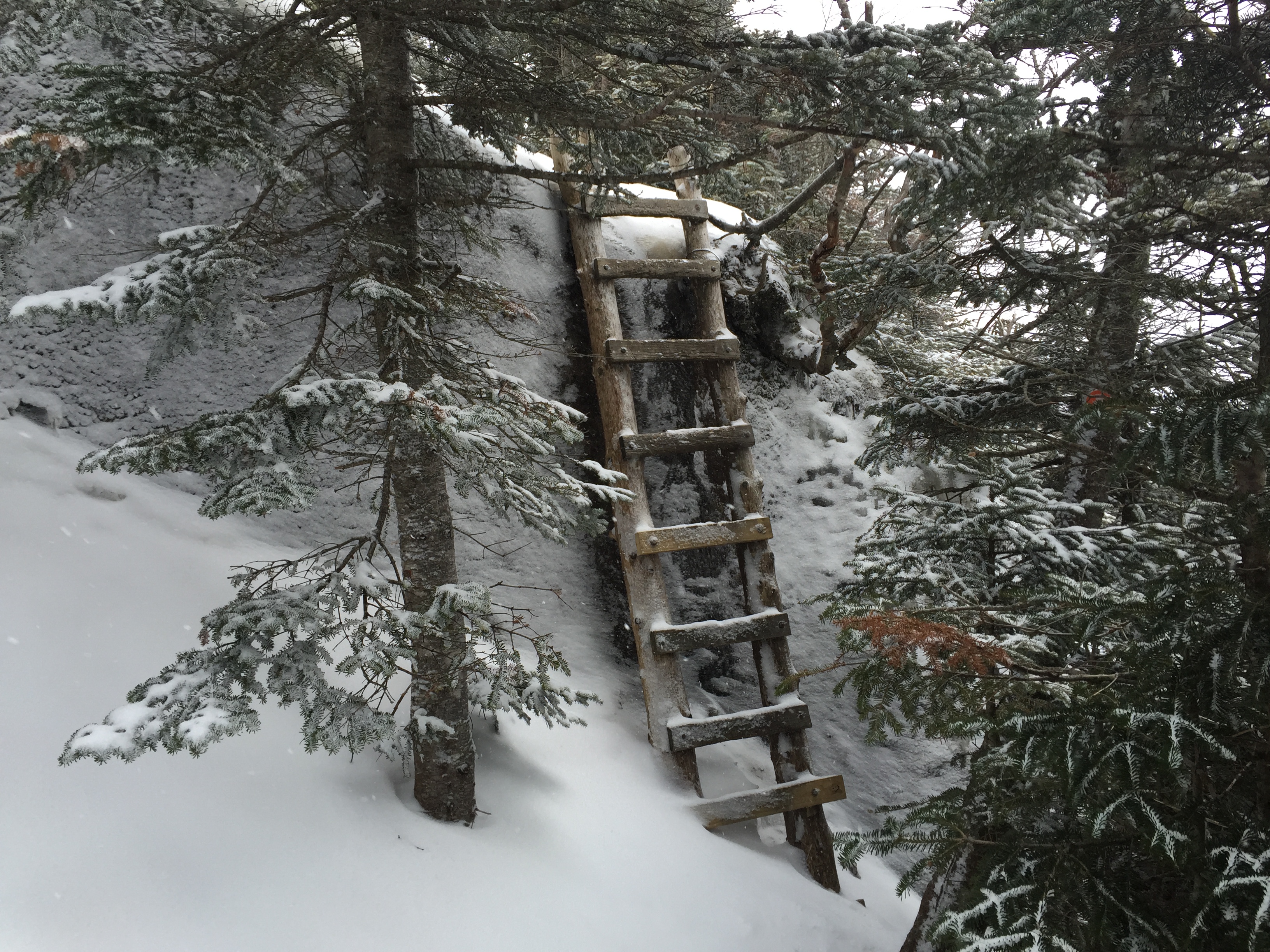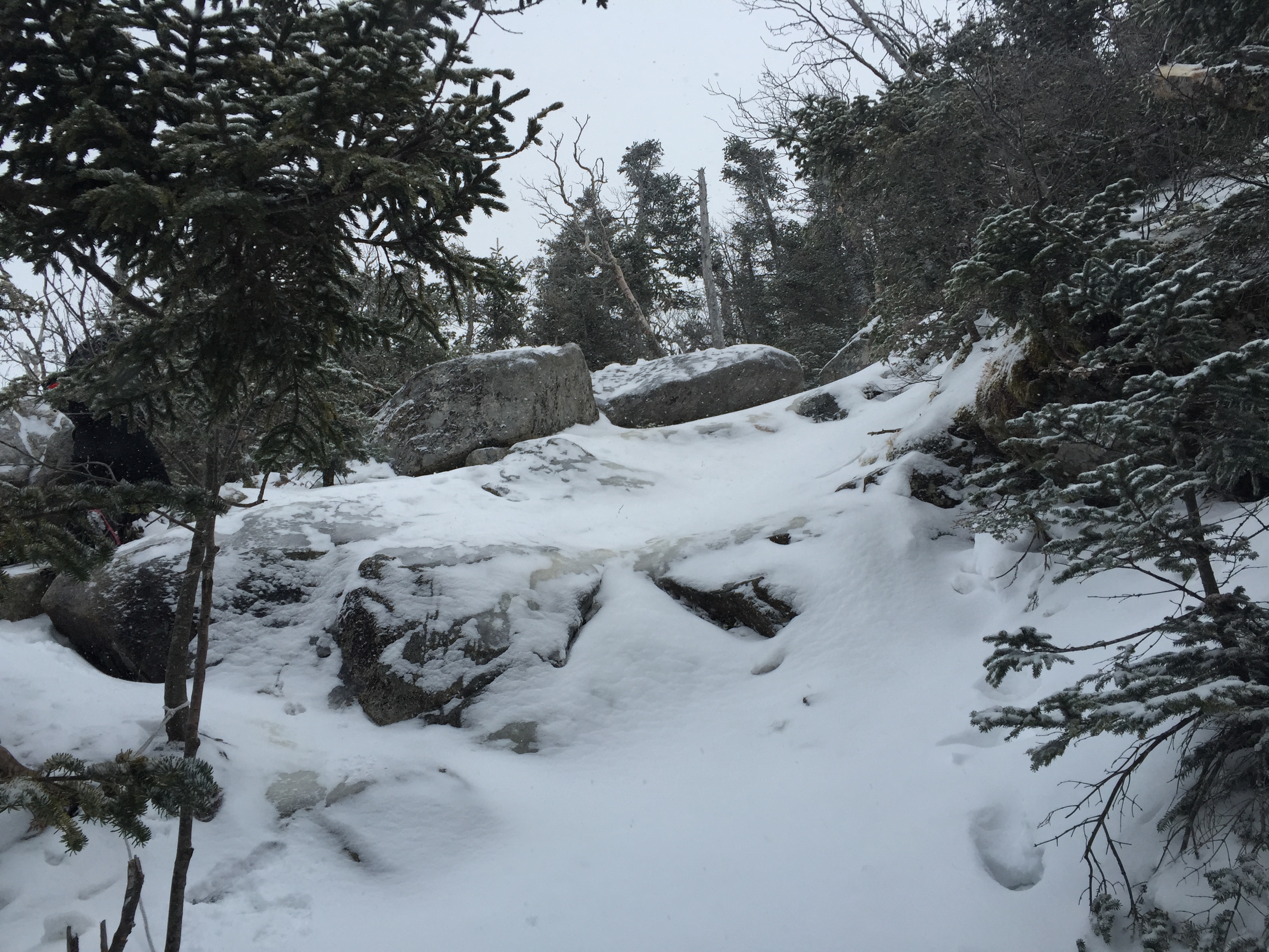 Despite the higher elevation the snow was still very thin and the trail was mostly hard packed snow with a thin layer of crusty ice on top. We made quick work on our way up and only had to slow down to navigate a few trickier steep sections. Luckily there were plenty of roots and rocks to grab on to so crampons weren’t necessary but they wouldn’t have hurt to have either.