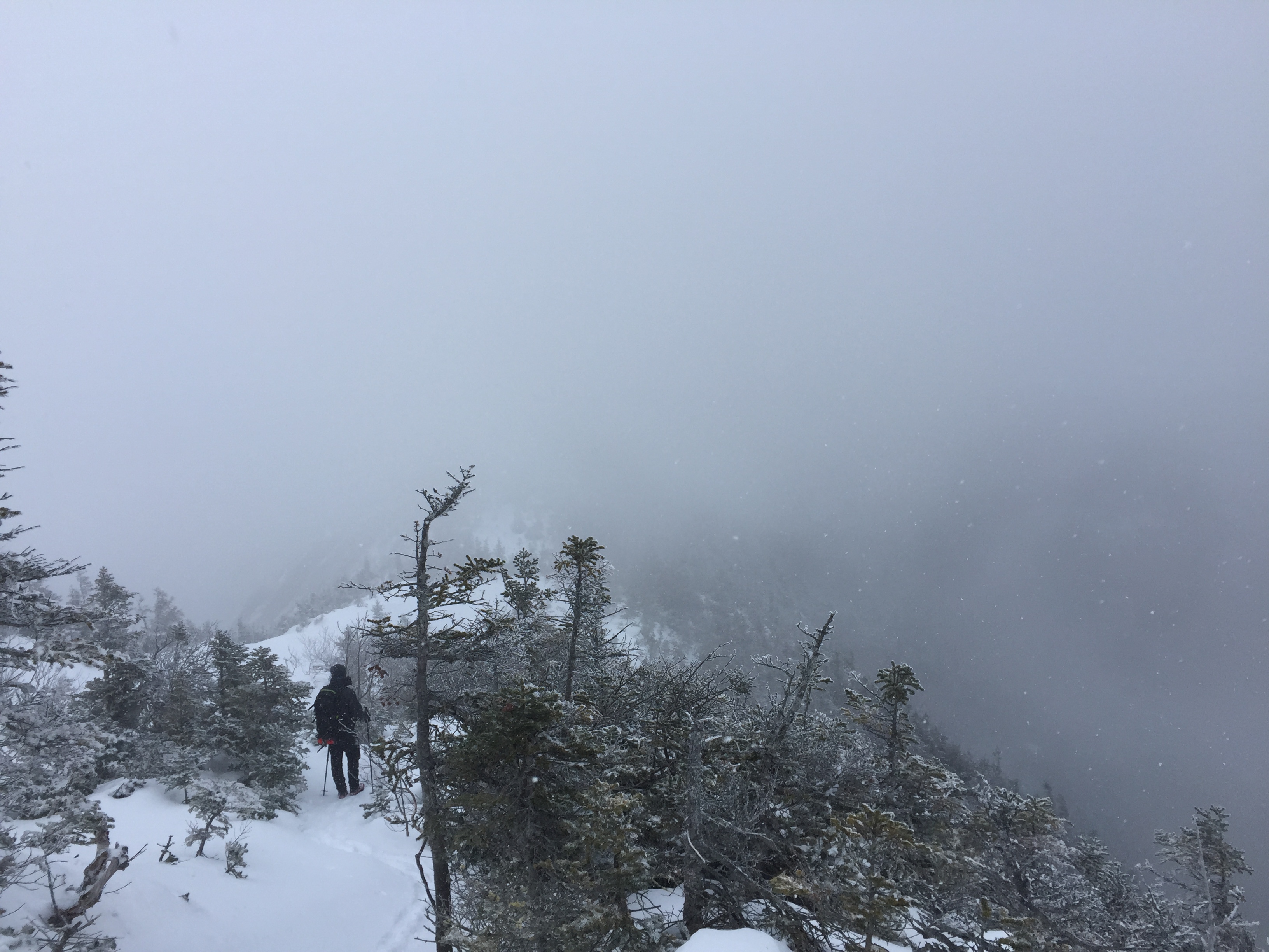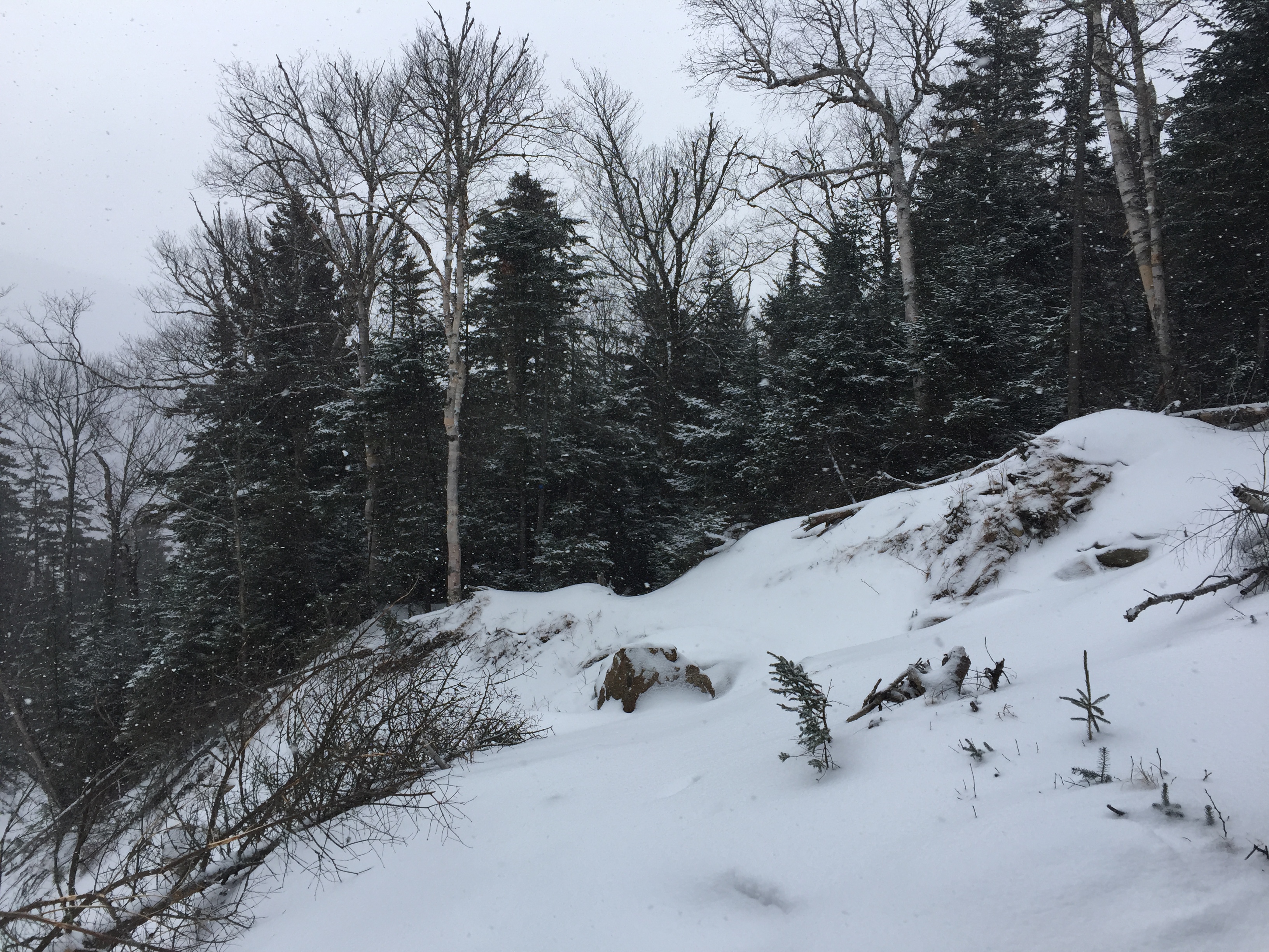 We lost the trail momentarily on this side of the mountain and even got caught in a couple of spruce traps before we realized our mistake and found the correct path. From here a short descent put us at the trail junction for Armstrong as well as an optional decent back to the road. At this point I considered continuing on to finish the Great Range but knowing that I didn’t have crampons for the steep ladder section between Armstrong and Upper Wolf Jaw made me vote against it. Instead I parted ways with Andrew and wished him luck on the rest of his day. He was moving fast so I knew he would have no problem tackling the rest of the range. In retrospect I should have just joined him as honestly it wouldn’t have been much longer than the decent I made off this side of the mountain.