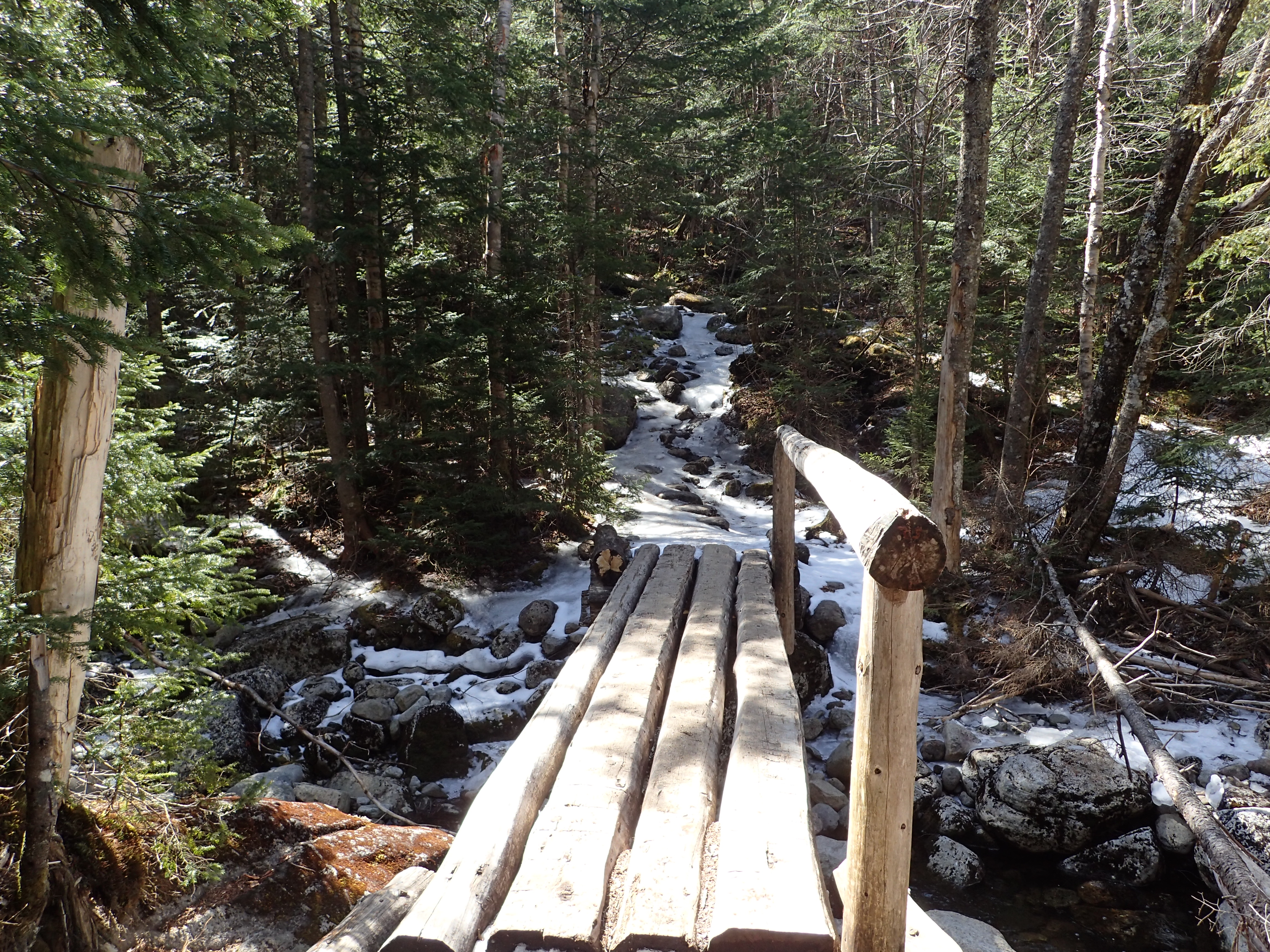 Before too long we reached the short bridge crossing over the brook. From here the elevation gain really began and we decided it was time to put on our spikes as the ice was clearly much worse from here.