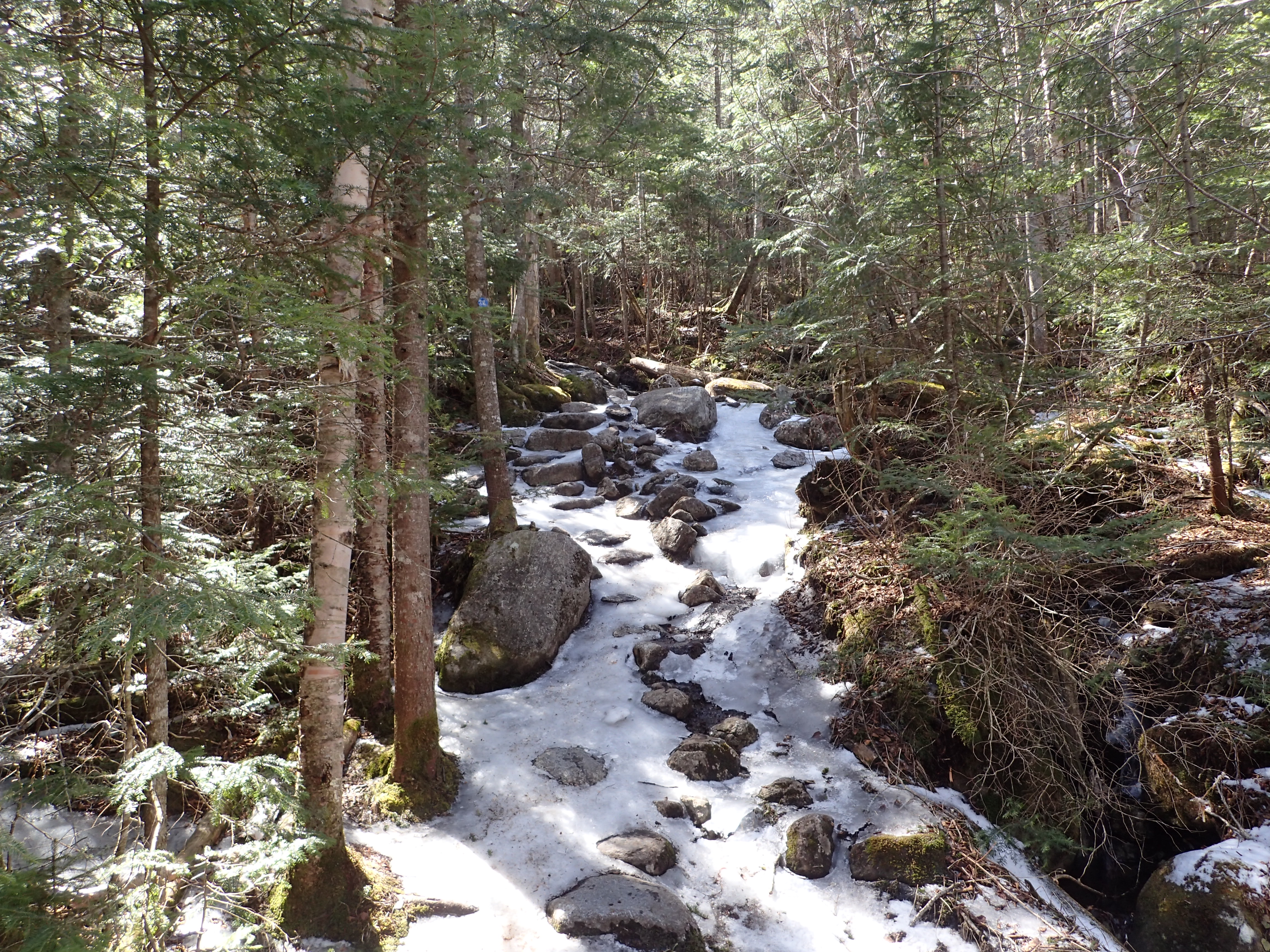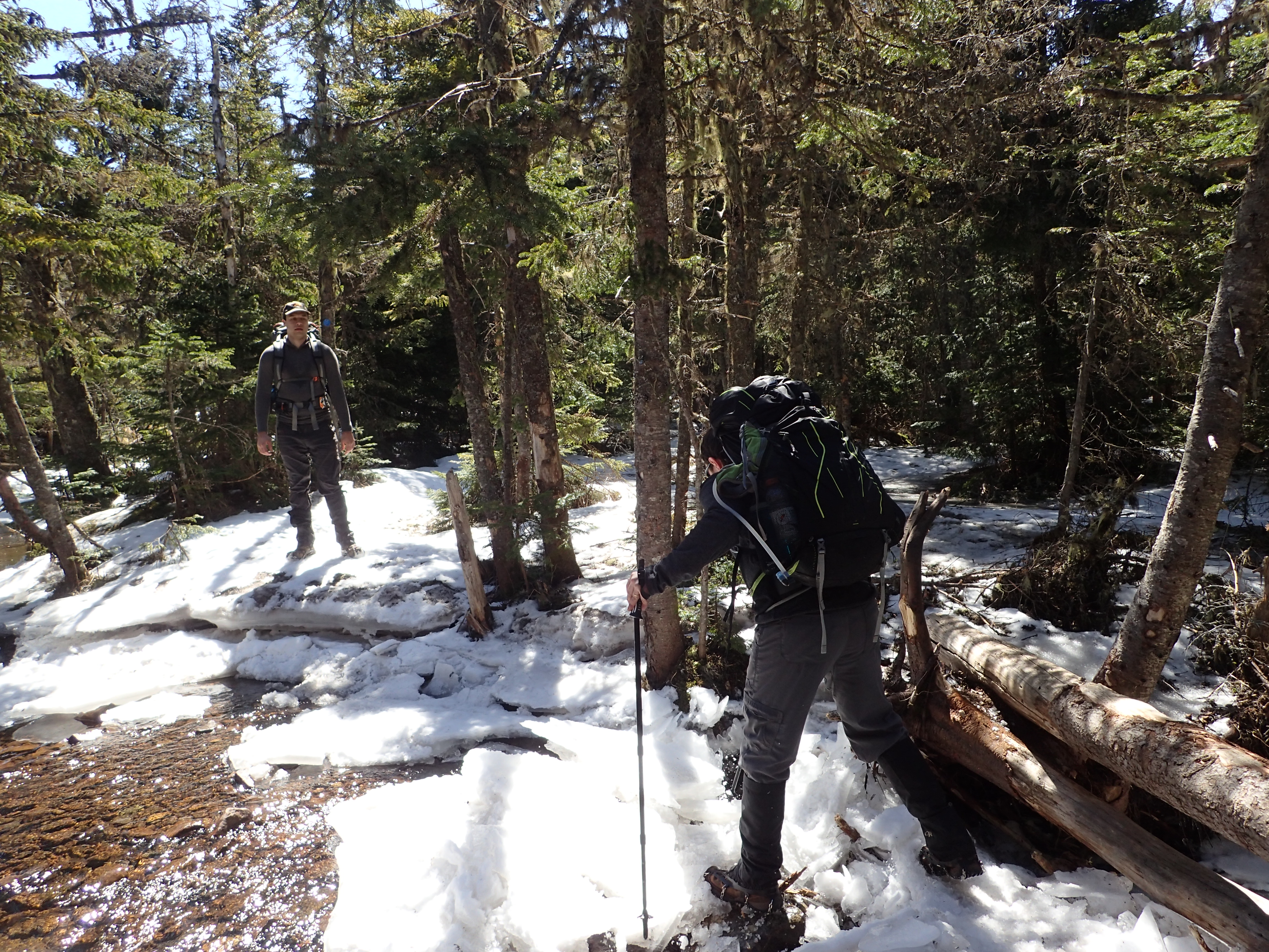 From here another short section of trail brought us to another brook crossing. This one was a mixture of logs and a sort of frozen block of ice. I would make sure to step on the log instead of whatever ice cover might be there as one in our group dodge a bullet when the ice crumbled underfoot. Luckily it didn’t collapse too far so he stayed dry.