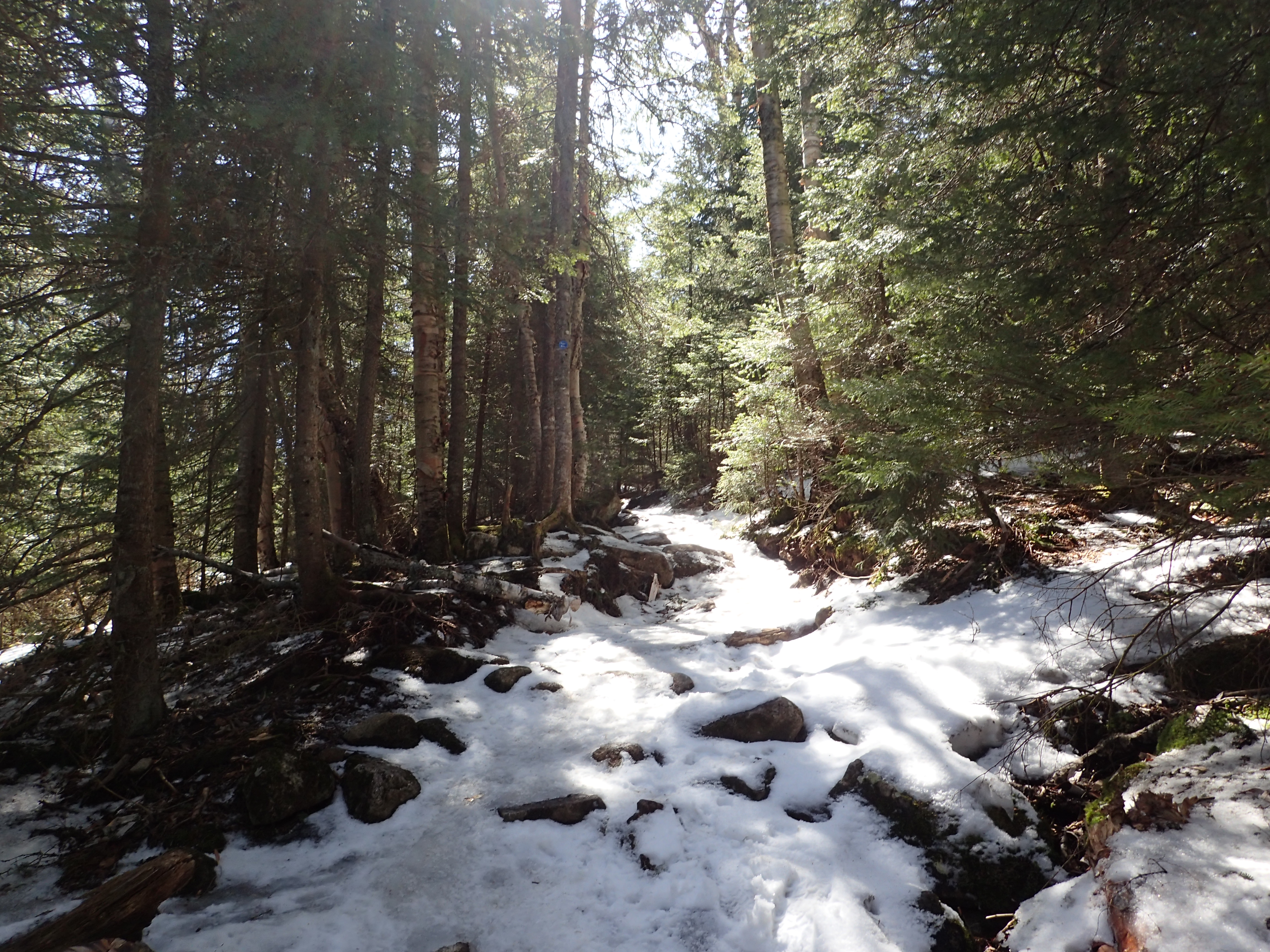 The one benefit of the overnight chill was that the mud was thankfully frozen solid in the morning which made for a much more pleasant start. Unfortunately we wouldn’t be so lucky on the hike out but what can you expect from mud season. After a very short section we came to the intersection with the ski trails and just kept heading straight towards Marcy Dam.