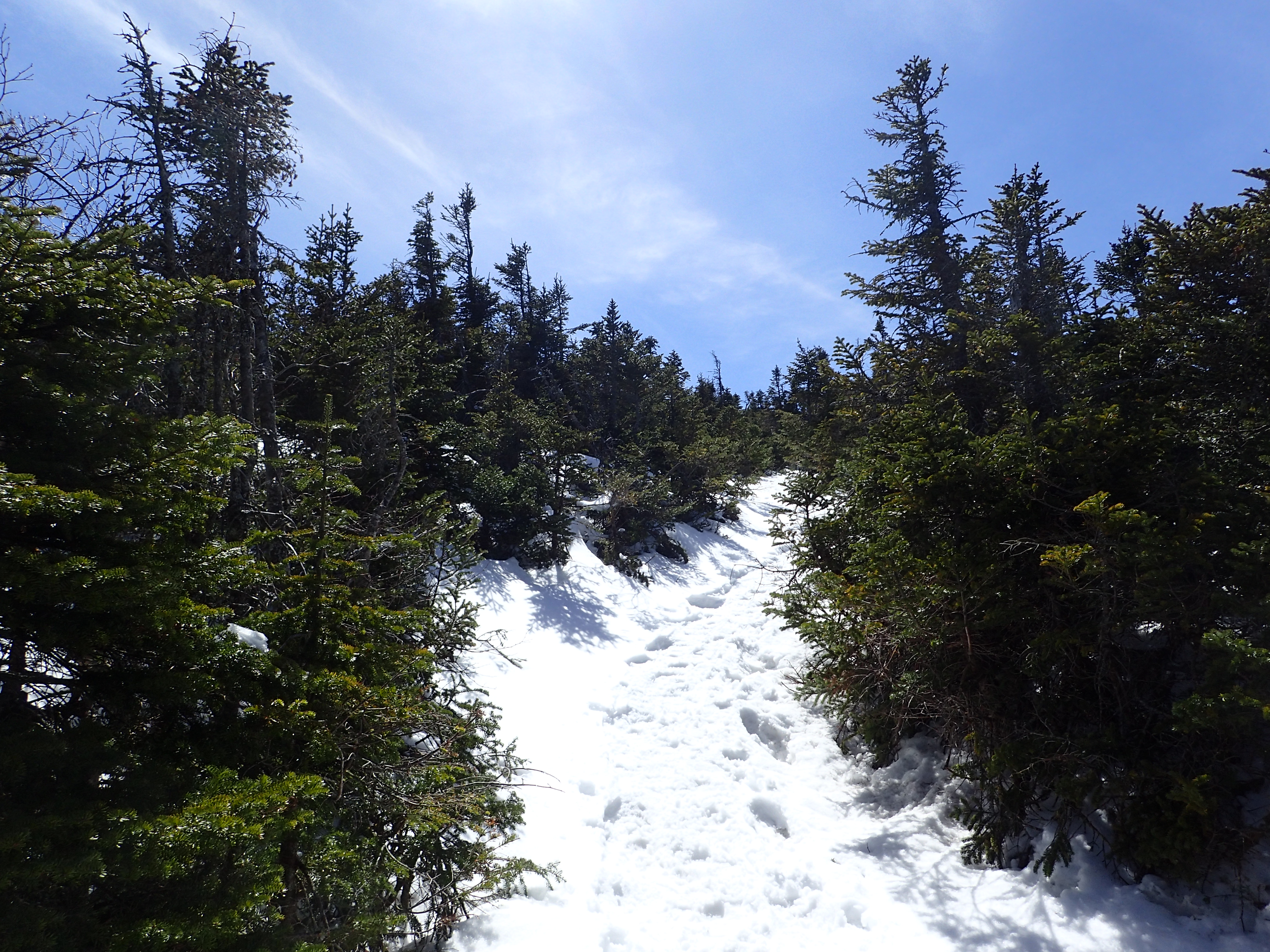 The trail continued on its steady upward slope in increasing snow before finally depositing us above treeline and on to to the rocky outcrops of the summit ridge.