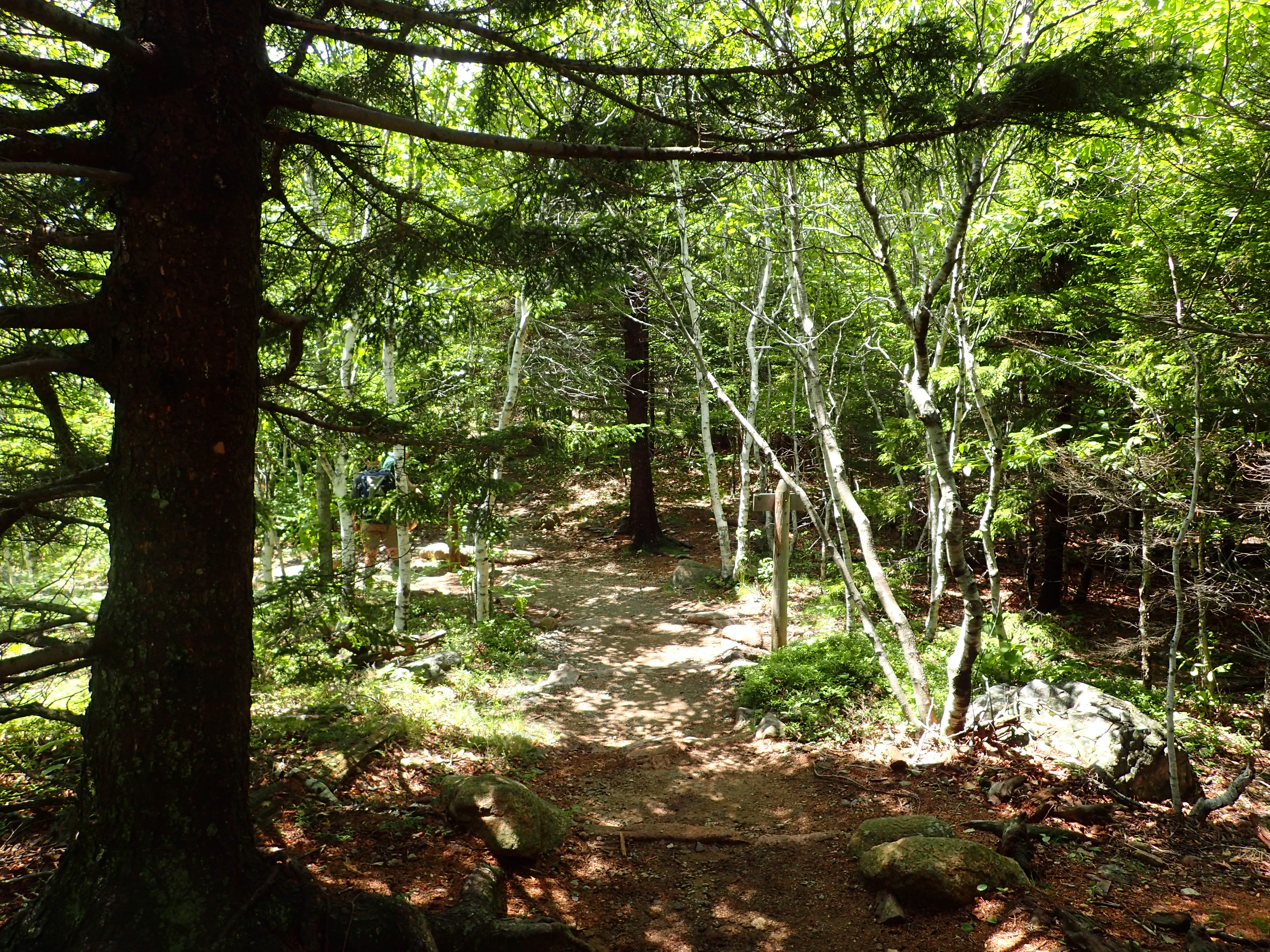 The trail itself leading up to the top of the Beehive is quite short but it is full of interesting climbing so it is usually a very popular choice for people. The precipice trail is a slightly longer and harder option to go up the cliffs directly to Champlain Mountain but due to the Peregrine Falcon nesting it was closed at the time of our visit. After a few minutes in the woods we reached the first junction pointing us up to the cliffs on the Beehive trail.