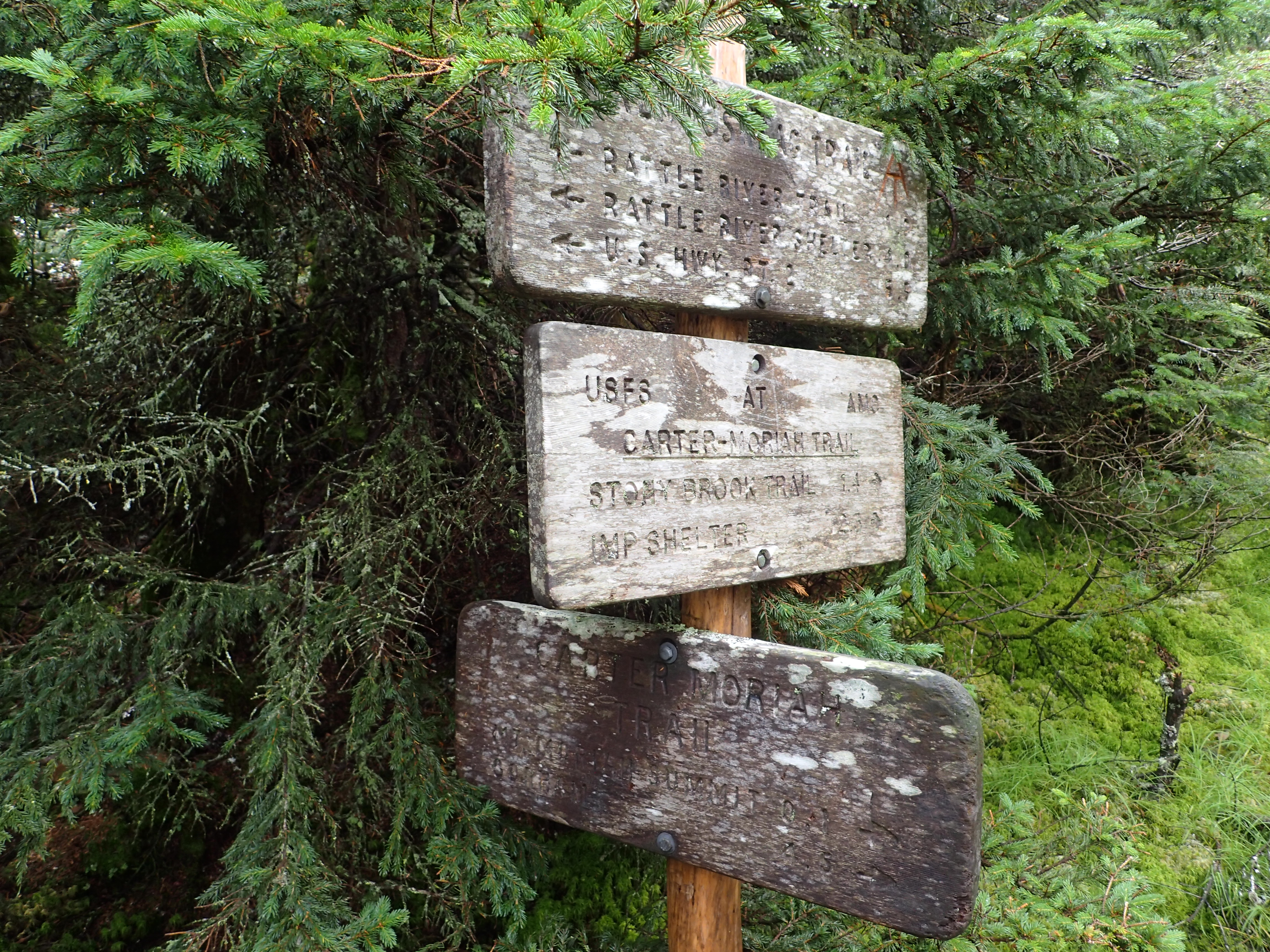 Another short section of trail through the woods and a couple of small ups and downs took us to another junction marking the trail to the summit of Mt Moriah (The Carter-Moriah Trail).