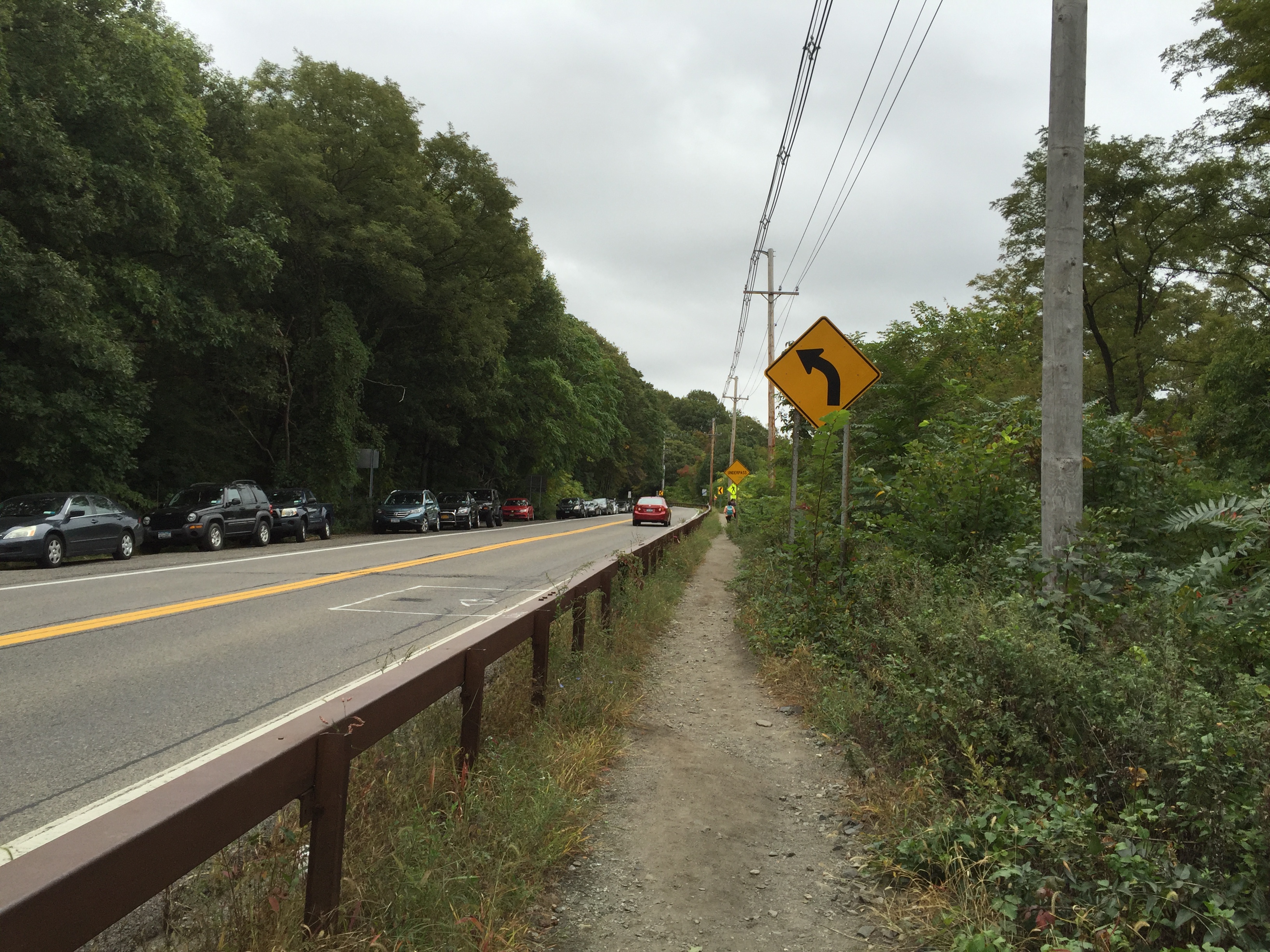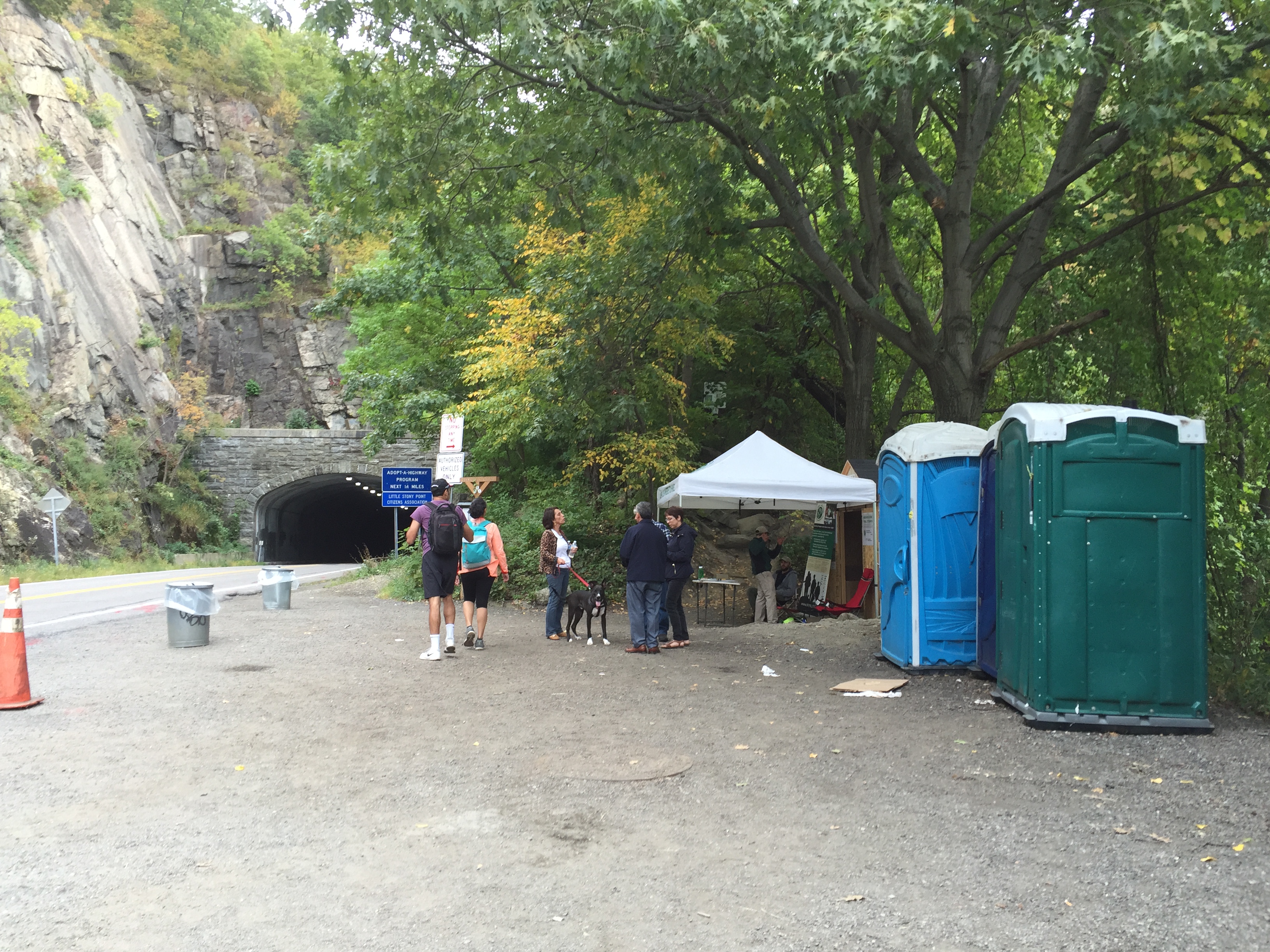 With limited time available and the crummy weather forecast we decided to spend this particular weekend close to home. After a little bit of brain storming we decided to head over to Breakneck Ridge in the Hudson Highlands. Kelly had never done this particular hike and it had been at least a year since I had done it so it seemed like a good choice. The hike consists of a good amount of easy scrambling on a small ridge that offers commanding views of the Hudson River below. Since this area is close to NYC and is easy to access by road or even train there are no shortage of people looking to scramble up the ridge. However, thanks to the crummy forecast on this particular day we did not have any issue finding a parking spot along 9D. The hike starts on the side of the tunnel on 9D and parking is available along the side of the road. After gathering our things we started walking up towards the tunnel and the start of the hike.