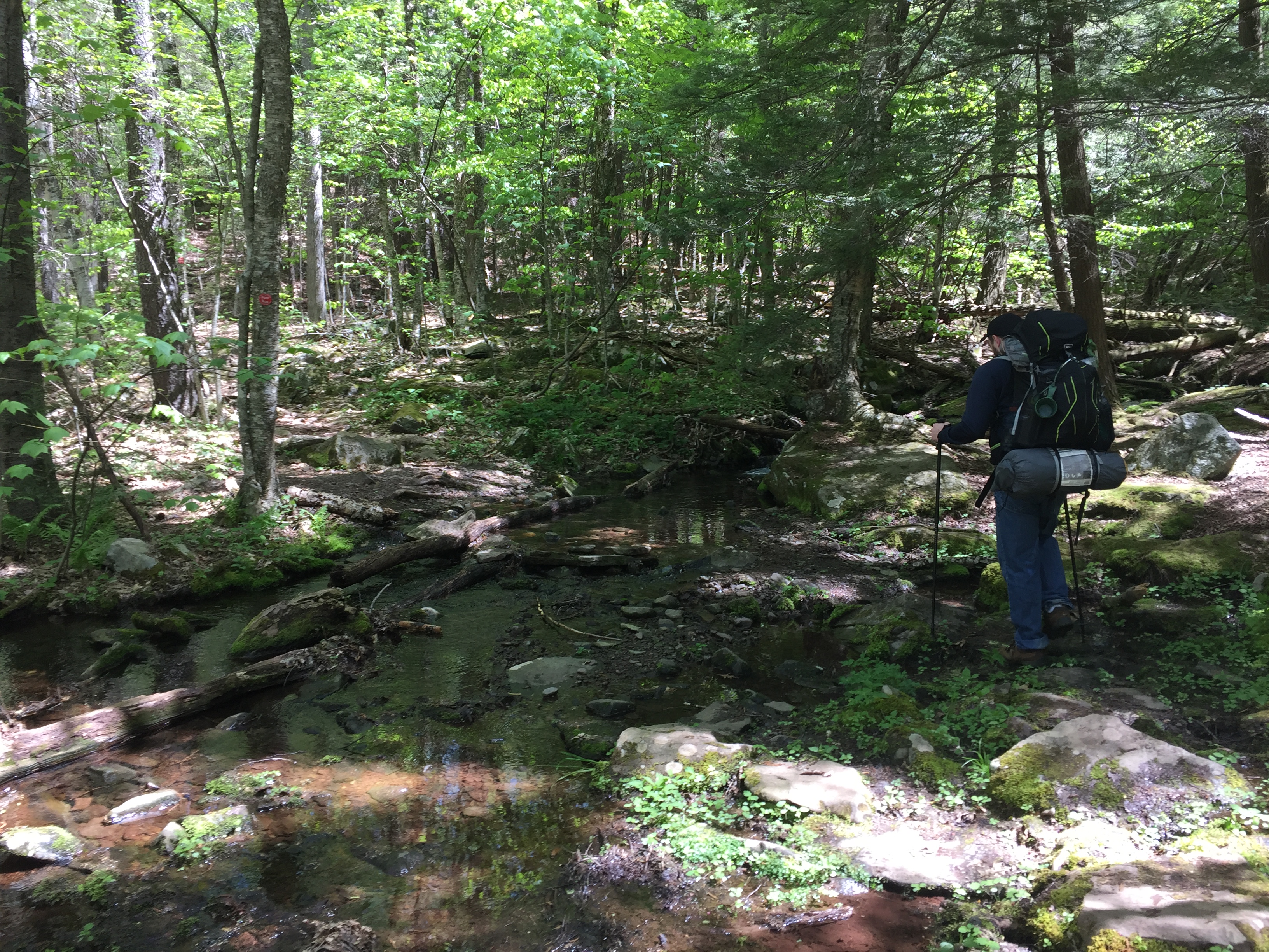 After passing the first brook crossing a mellow section of mostly flat trail through an evergreen forest brought us to the second brook crossing. This one required a little more imagination to cross but there were plenty of rocks to hop across.