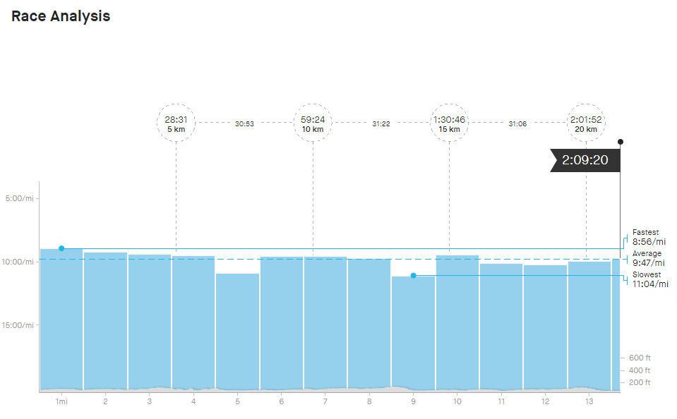 This run felt pretty good and I was able to keep a pretty consistent pace. The two noticeable blips are from bathroom stops. I have been recently running my regular halfs on a pretty flat course that stays out in the sun the whole time and is open and easy to avoid others on the weekend. On the weekend narrow single track can be a hassle because the local parks can be crowded with people walking their dogs and strolling etc.